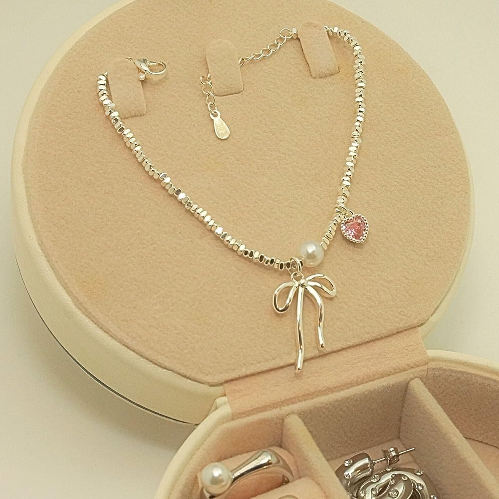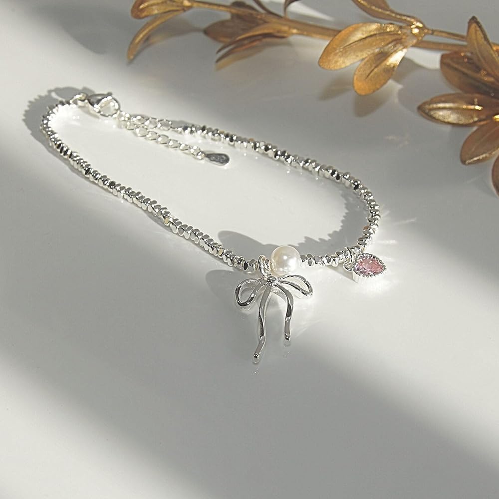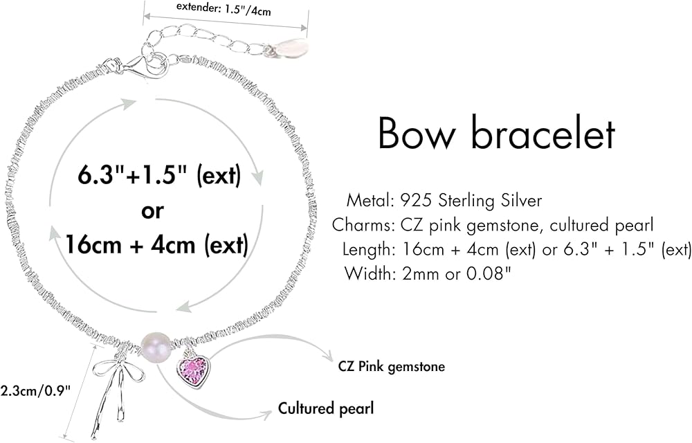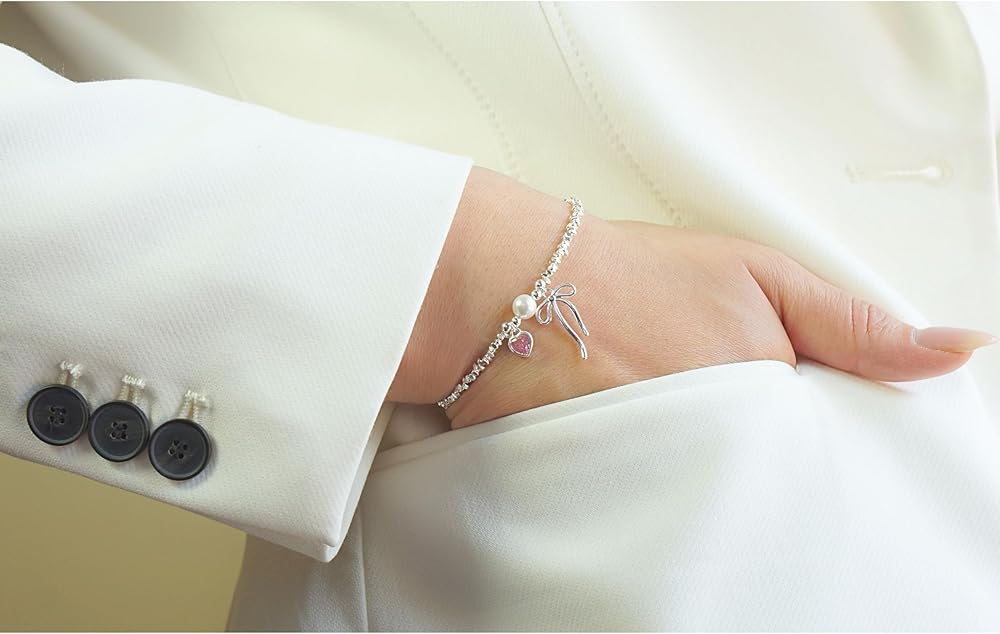 QueenBee 925 Sterling Silver Pink Heart Bow Charm Pearl Bracelet, Elegant Charm Bracelets for Women, Trendy Silver Jewelry Birthday, Valentines Day, Wedding, Bridal, Mother's Day Gift for Her