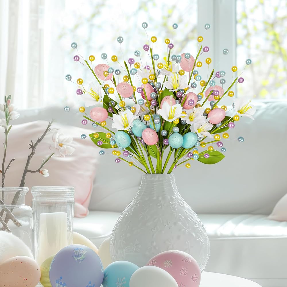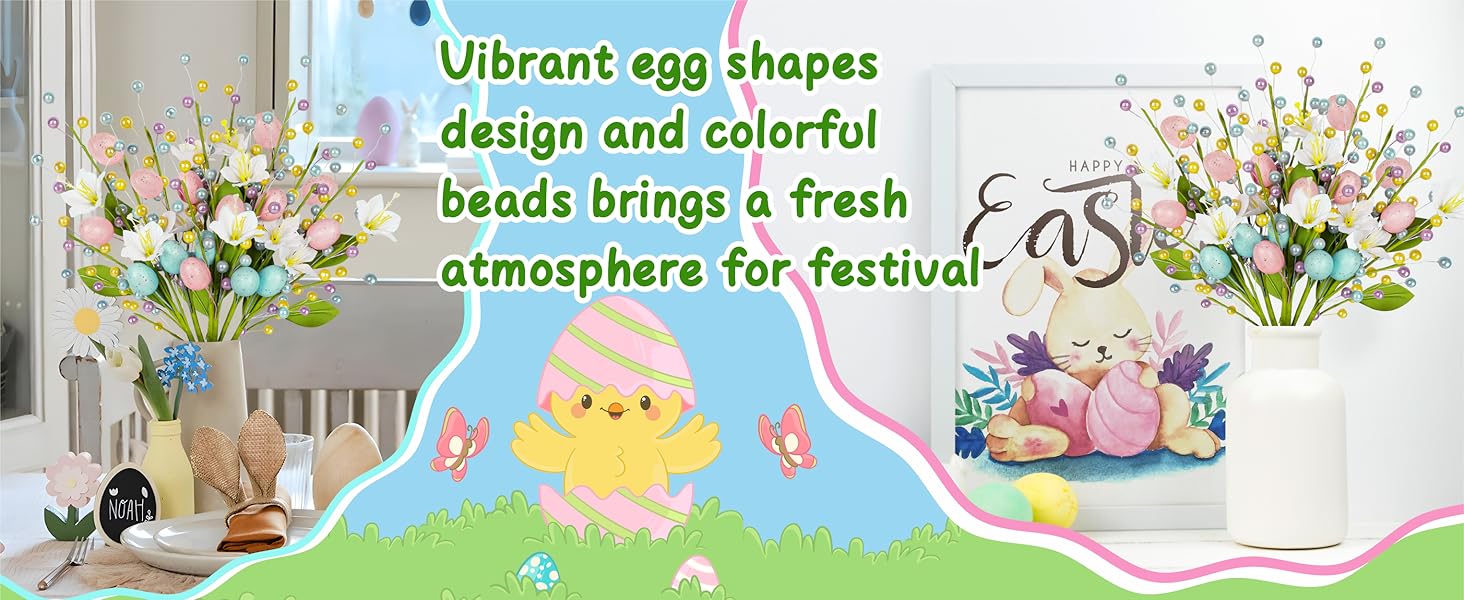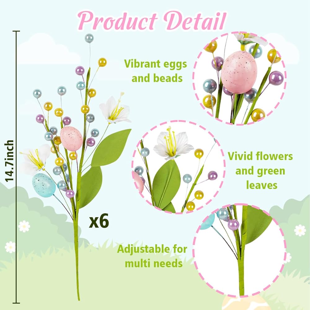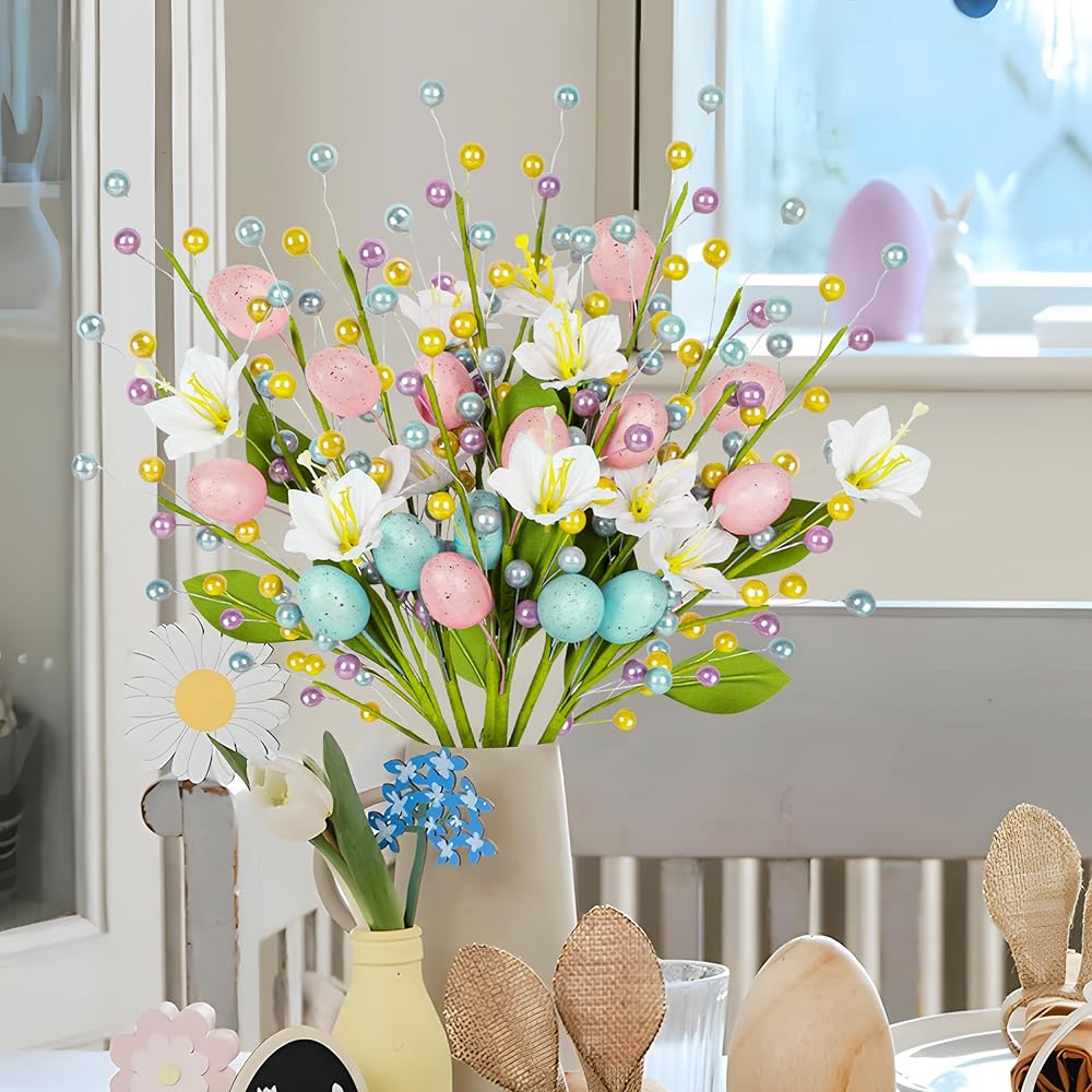 زهور وبيض نابضة بالحياة: تتميز كل قطعة ببيض وزهور وخرز نابضة بالحياة. الأوراق الخضراء المرنة تعطي الأعواد مظهرًا طبيعيًا ومنعشًا، مما يضيف لمسة من الربيع