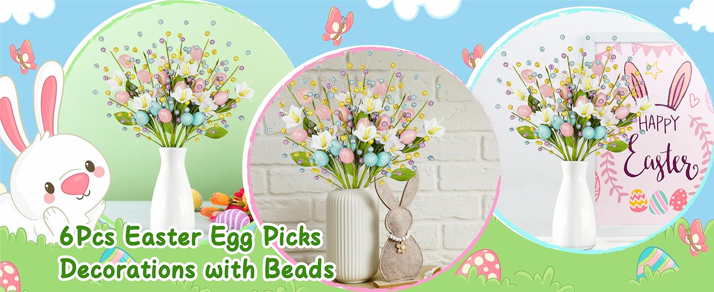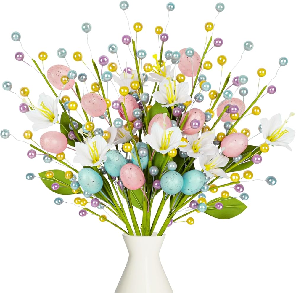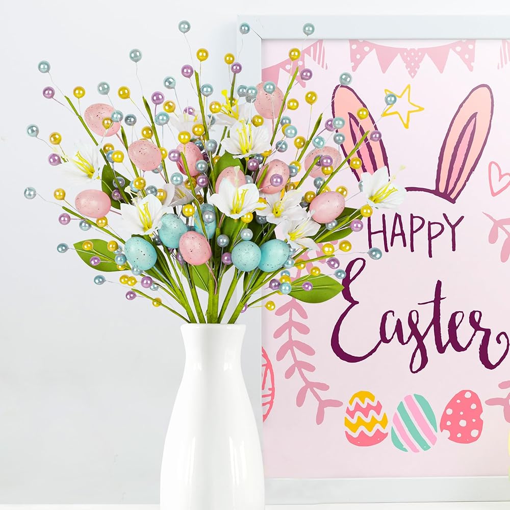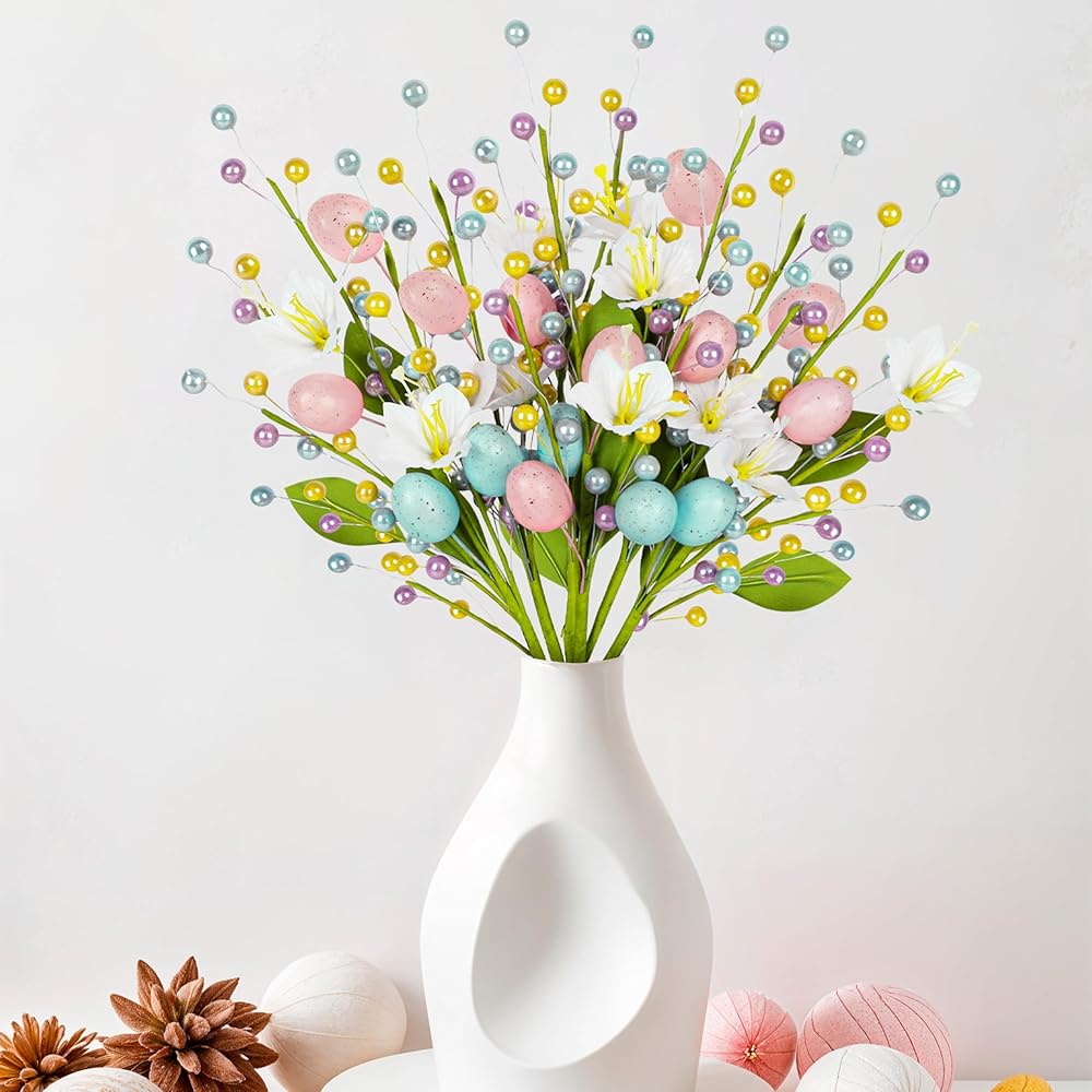 زهور وبيض نابضة بالحياة: تتميز كل قطعة ببيض وزهور وخرز نابضة بالحياة. الأوراق الخضراء المرنة تعطي الأعواد مظهرًا طبيعيًا ومنعشًا، مما يضيف لمسة من الربيع