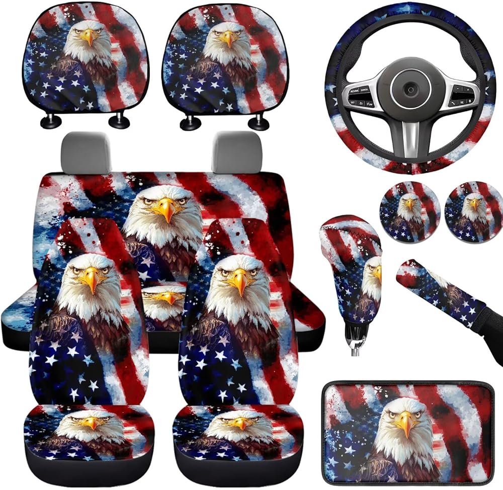 12 PIECES CAR ACCESSORIES SET:Including 2 car front seat covers,2 rear bench seat cover,1 steering wheel cover,1 vehicle center console armrest cover pad, 2 car cup holder coaster,1 gear shift cover,1 car handbrake cover, 2 car Headrest cover which are a complete set to keep your car interior decorate and protect your car