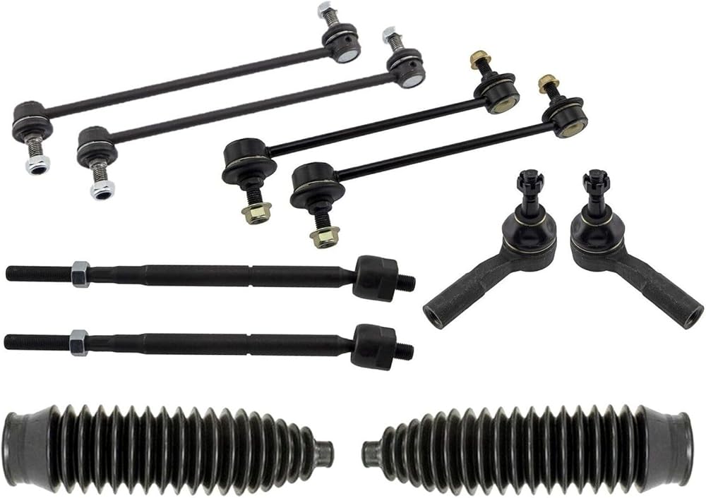 • Item Offered: 2 front inner tie rod ends, 2 front sway bar end links 11.8 inch center to center, 2 front outer tie rod ends, 2 rack and pinion bellow boots, 2 front sway bar end links 9.86 inch center to center