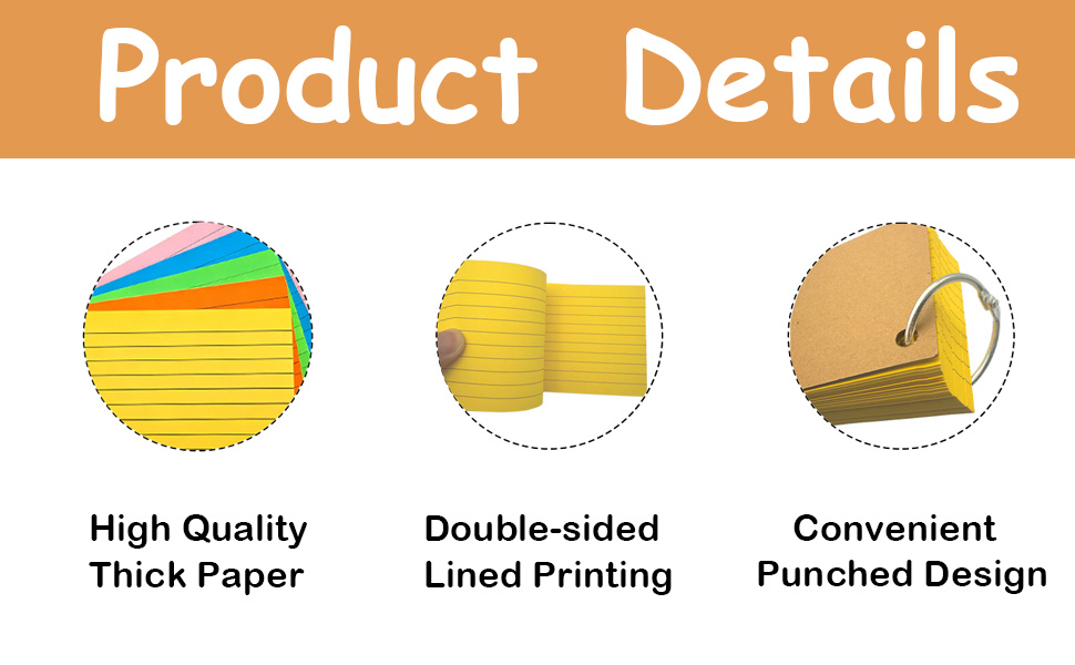 【مادة متينة】 بطاقات الفلاش ذات الحلقات مصنوعة من ورق عالي الجودة على الوجهين، وتتميز بسطح أملس يتيح الكتابة بسلاسة دون نزيف الحبر. يأتي كلا الجانبين الأمامي والخلفي بخطوط مسطرة لسهولة تدوين الملاحظات.