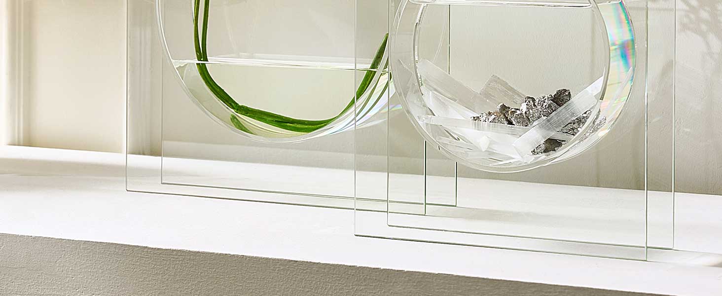 الديكور: الاحتمالات لا حصر لها مع مزهريات سولاريس الزجاجية الشفافة. يتميز بوعاء على شكل بيضاوي يقع بين لوحين زجاجيين لتصميم عصري جريء.