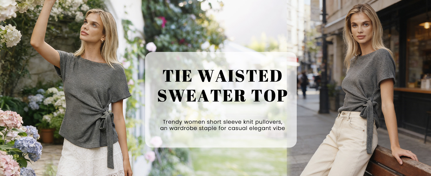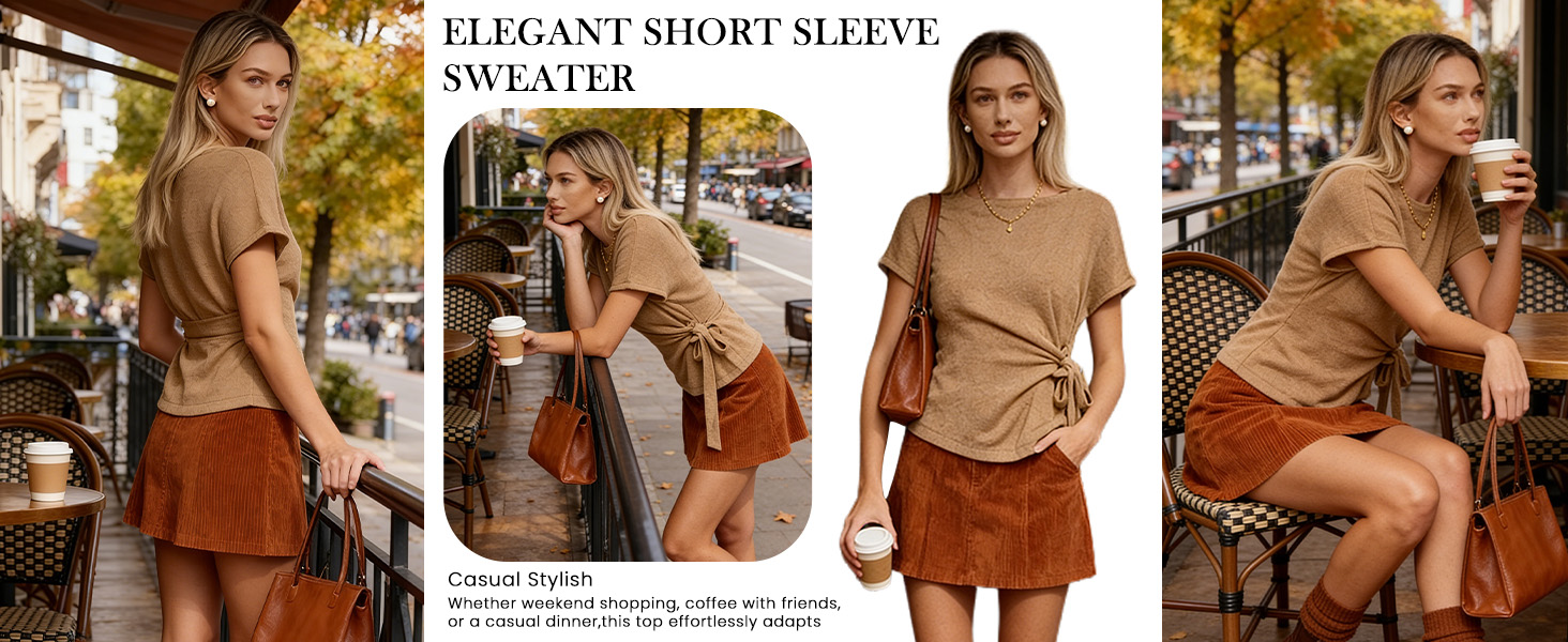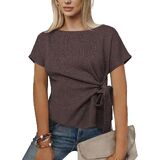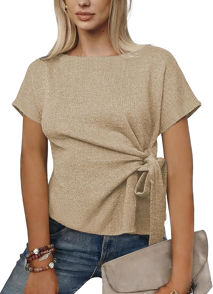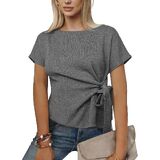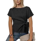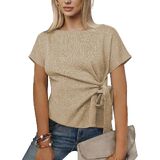 التصميم: يتميز هذا القميص ذو الأكمام القصيرة والرقبة المستديرة بتصميم خصر عصري مربوط مما يخلق صورة ظلية ملفوفة جذابة تسمح بملاءمة قابلة للتعديل تضيف لمسة أنثوية أنيقة ترفع مظهرك اليومي