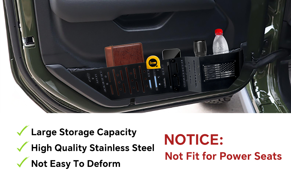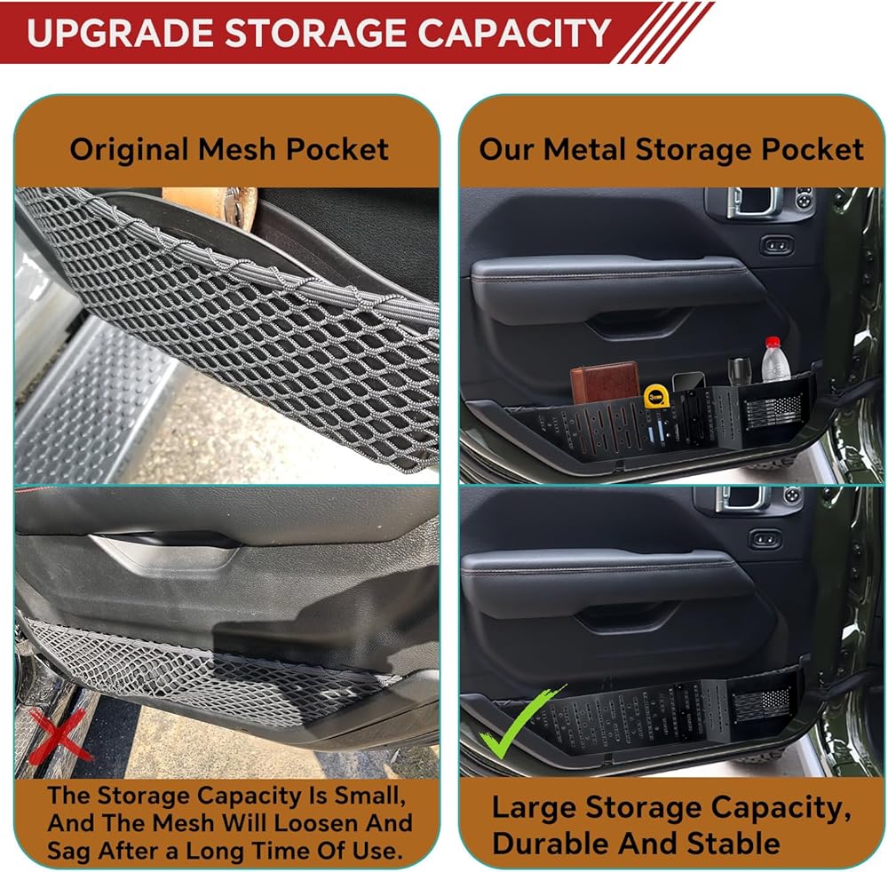【ترقية سعة التخزين】سعة تخزين الجيب الشبكي الأصلي صغيرة، وسترتخي الشبكة وتترهل بعد فترة طويلة من الاستخدام. جيب التخزين المعدني الخاص بنا بسعة تخزين كبيرة، متين ومستقر. يمكنه تخزين الهواتف المحمولة، وزجاجات المشروبات، وأجهزة الكمبيوتر المحمولة، وأكياس الوجبات الخفيفة، والمصابيح الكاشفة والمزيد