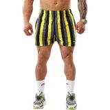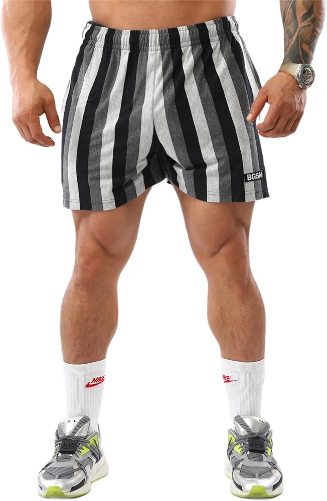 These BGSM men's gym shorts combine bold style with practical performance for your fitness routine. Featuring eye-catching yellow and black vertical stripes, these athletic shorts make a confident statement whether you're hitting the gym, training outdoors, or engaging in your favorite sport. Crafted from 100% cotton, these lightweight fitness shorts offer natural breathability and comfort during intense workouts. The thin fabric construction ensures optimal airflow to keep you cool when the temperature rises, while the soft cotton material moves with your body through every rep, sprint, and stretch. The convenient lace-up waistband provides a customizable, secure fit that stays in place during dynamic movements. With a extra short length design, these training shorts offer unrestricted mobility for squats, lunges, and leg day exercises. The relaxed fit accommodates athletic builds while maintaining a streamlined silhouette. Perfect for bodybuilders, fitness enthusiasts, and active individuals who appreciate both function and distinctive style in their workout wardrobe.