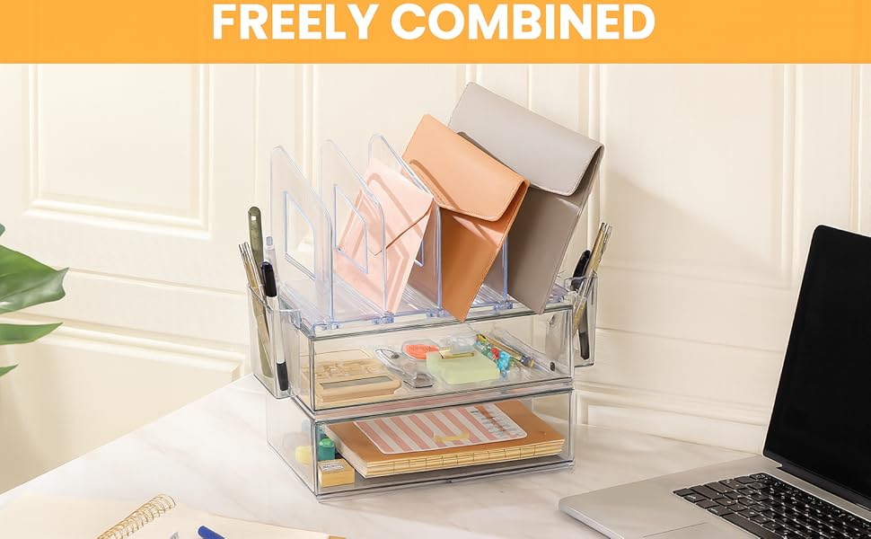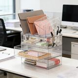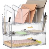 • منظم مكتب متعدد الوظائف: 4-حامل ملفات عمودي، 3-درج شفاف، و2 حامل أقلام. مجموعة منظم مكتب من الأكريليك الشفاف مكونة من عبوتين للملفات والمستندات والقرطاسية واللوازم المكتبية. تتضمن 1 فارز ملفات (10.4 بوصة طول × 6.6 بوصة عرض × 5.5 بوصة ارتفاع) ودرجين كبيرين (13 بوصة طول × 6.7 بوصة عرض × 3.1 بوصة ارتفاع لكل منهما). مثالية للحفاظ على مساحة العمل الخاصة بك مرتبة على المكاتب، أو الرفوف، أو أسطح العمل.
