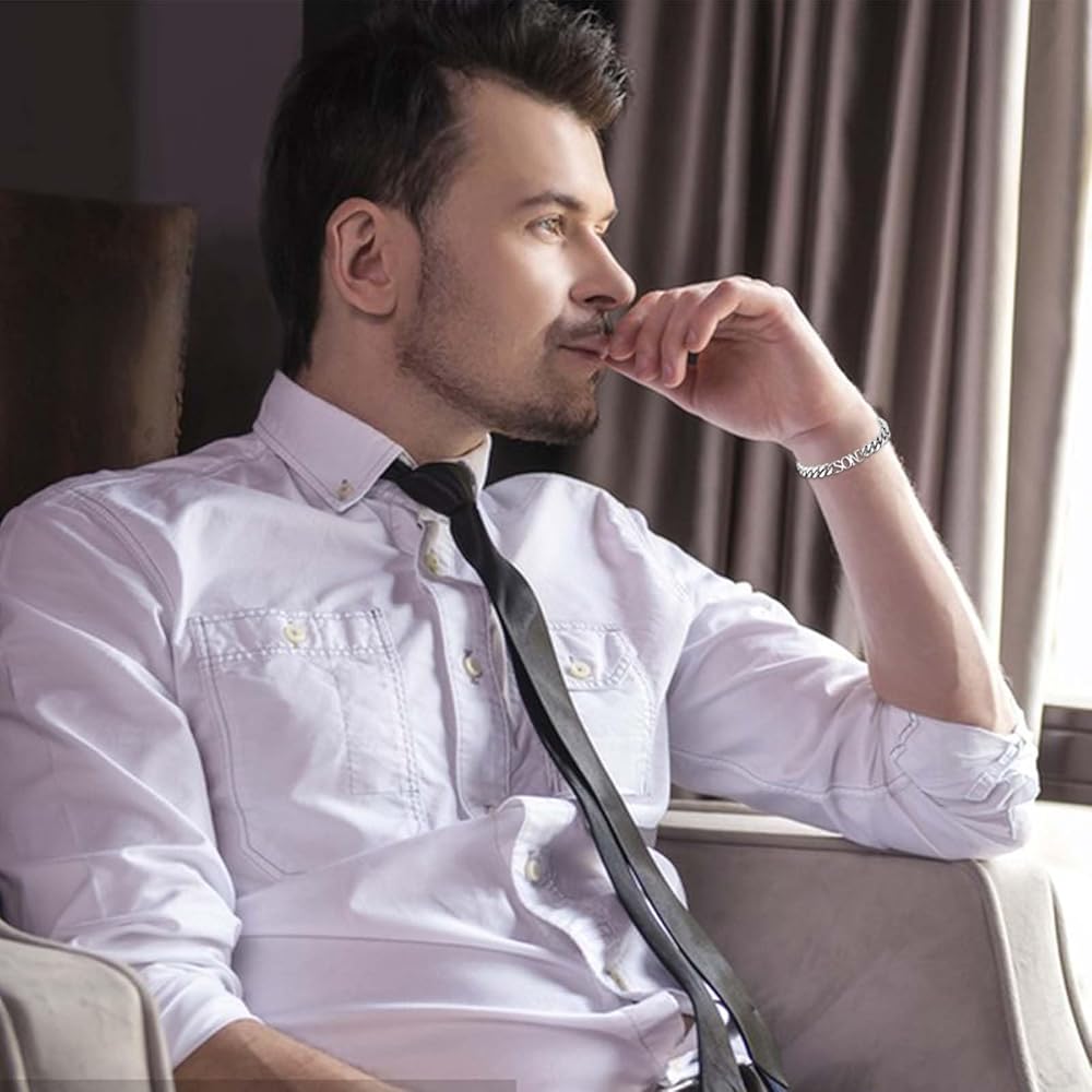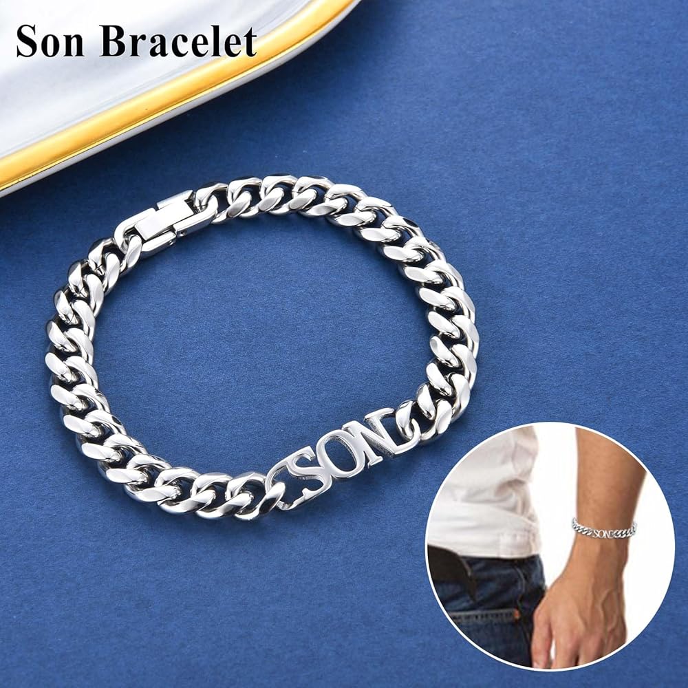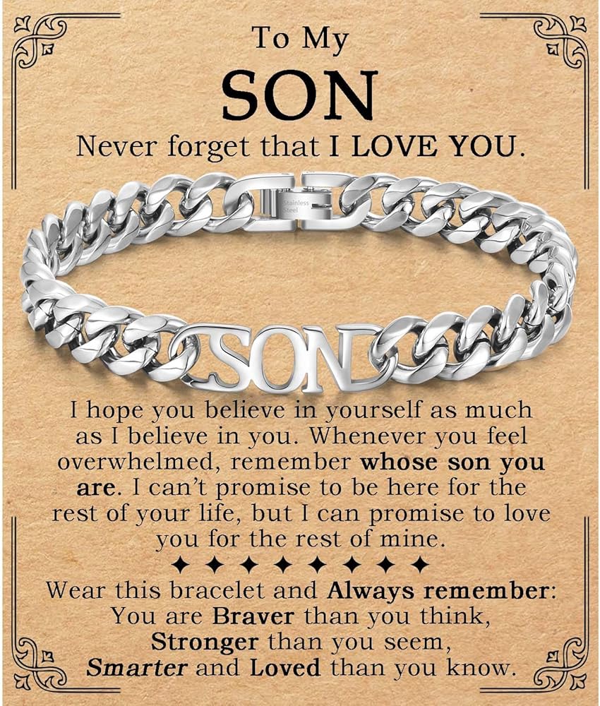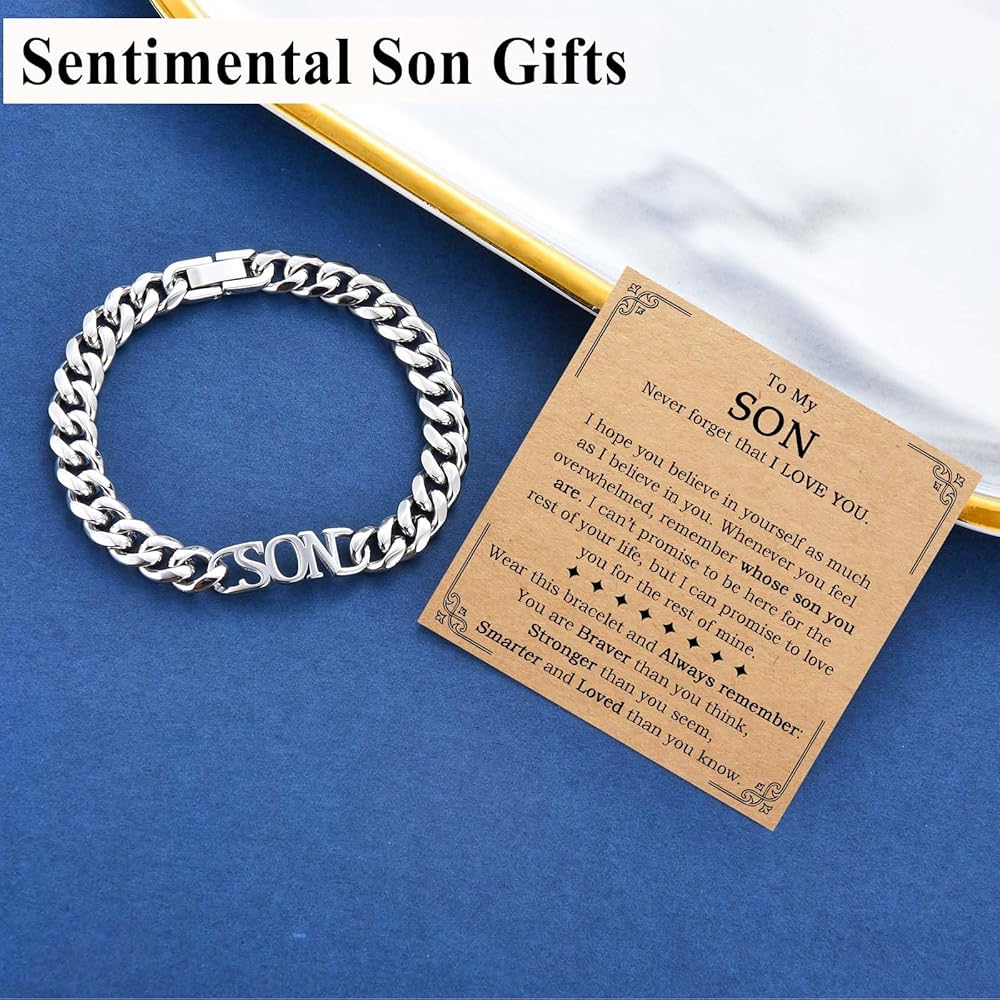 • سوار الابن: هذا السوار المصنوع من الفولاذ المقاوم للصدأ للرجال والأولاد المراهقين منقوش عليه كلمة "SON". تصميم بسيط ولكن ذو معنى، هو هدية رائعة لتقديمها لابنك والتعبير عن حبك مباشرة. عندما يرتدي هذا السوار، سيذكره "كلما شعرت بالإرهاق، تذكر ابن من أنت. أنت أكثر شجاعة مما تعتقد، وأقوى مما تبدو عليه، وأذكى ومحبوبًا مما تعلم." هدايا صبي في سن المراهقة العصرية لابنه.