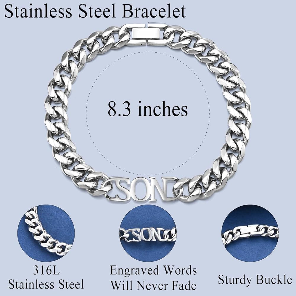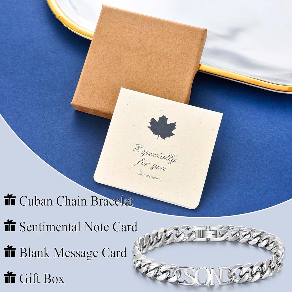 • هدايا عاطفية للابن: يأتي هذا السوار ذو السلسلة الكوبية للرجال والأولاد المراهقين في صندوق هدايا، مع بطاقة ملاحظة عاطفية وبطاقة رسالة فارغة. كل شيء على استعداد لإعطاء ابنك في كل مهرجان لا ينسى. أفضل هدايا عيد الحب/عيد الأب/عيد الفصح/الكريسماس/عيد الشكر/عيد الميلاد/التخرج للابن.
