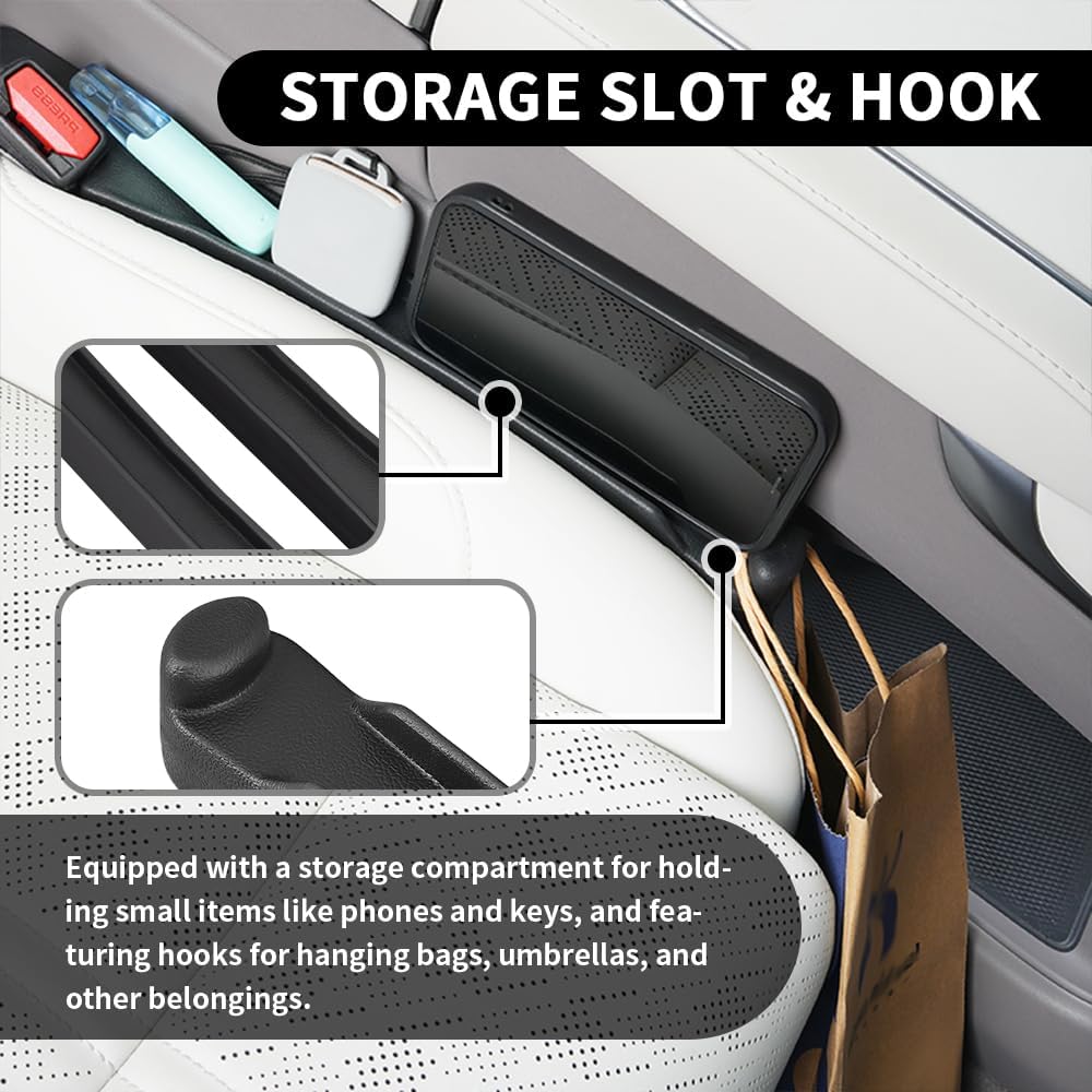 CAR SEAT GAP FILLER WITH HOOKS AND STORAGE SLOTS, FILL SEAT GAPS, YOU DESERVE IT