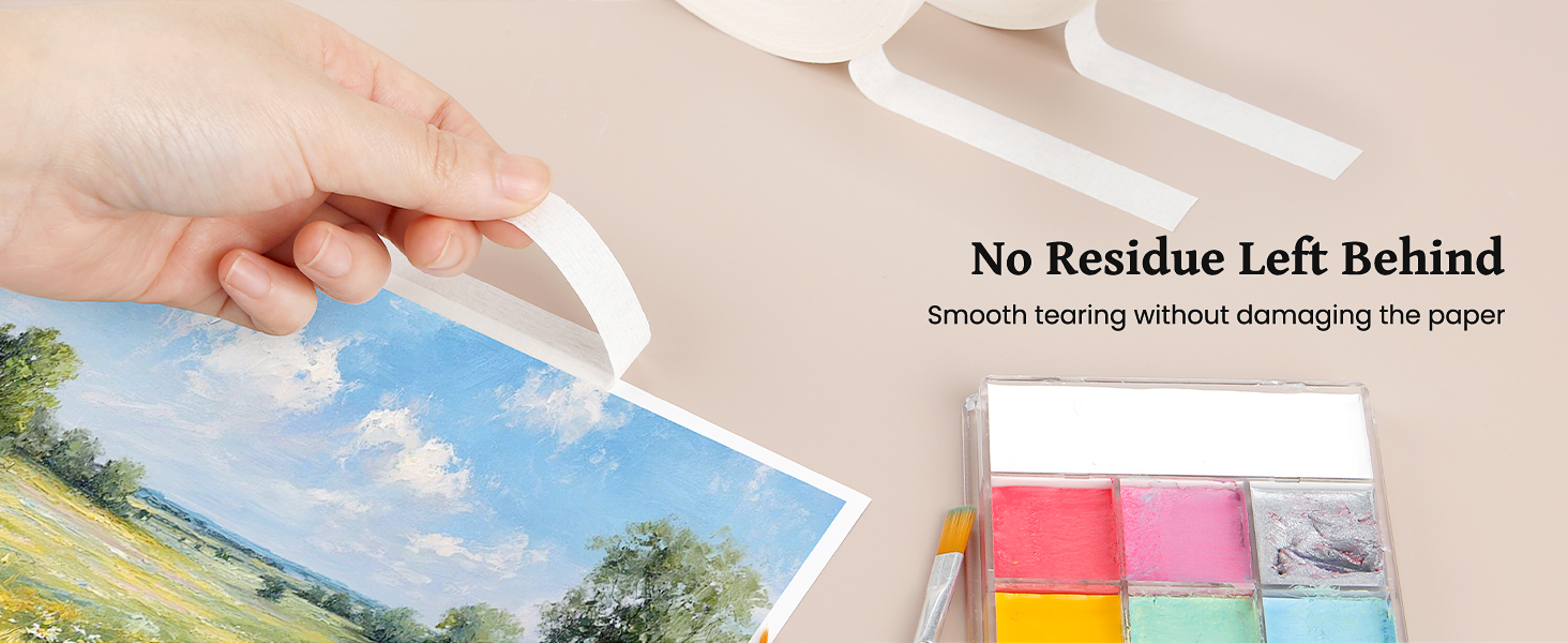 الاحتفاظ الدقيق بالحواف: تظل حواف الشريط اللاصق مسطحة وخالية من التجعيد، مما يضمن حواف واضحة ومستقيمة للرسوم التوضيحية بالألوان المائية، وإخفاء دقيق للرسومات، وتحديد موضع دقيق لمجموعات سجل القصاصات