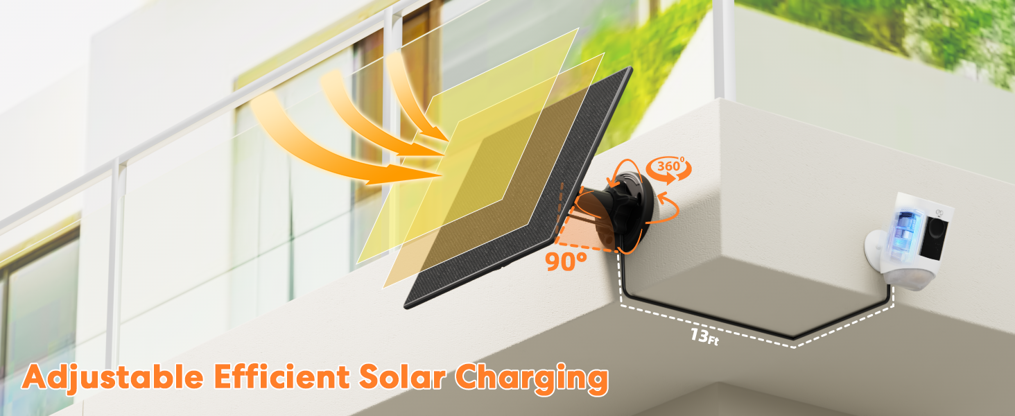 • 【إمداد طاقة مستمر】يتم إقران اللوحة الشمسية عالية الكفاءة بقدرة 5 وات مع كابل طويل للغاية بطول 13 قدمًا لامتصاص الطاقة الضوئية طوال اليوم لضمان إمداد الطاقة المستمر للكاميرا، وقولي وداعًا لمشكلة التفكيك المتكرر واستبدال البطارية.