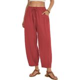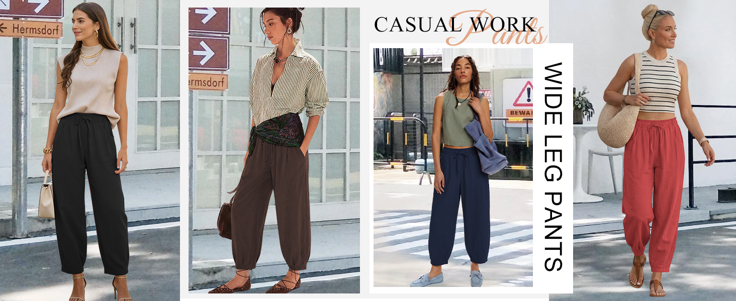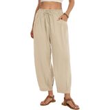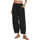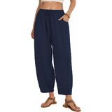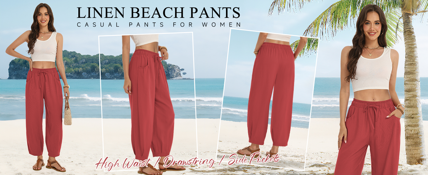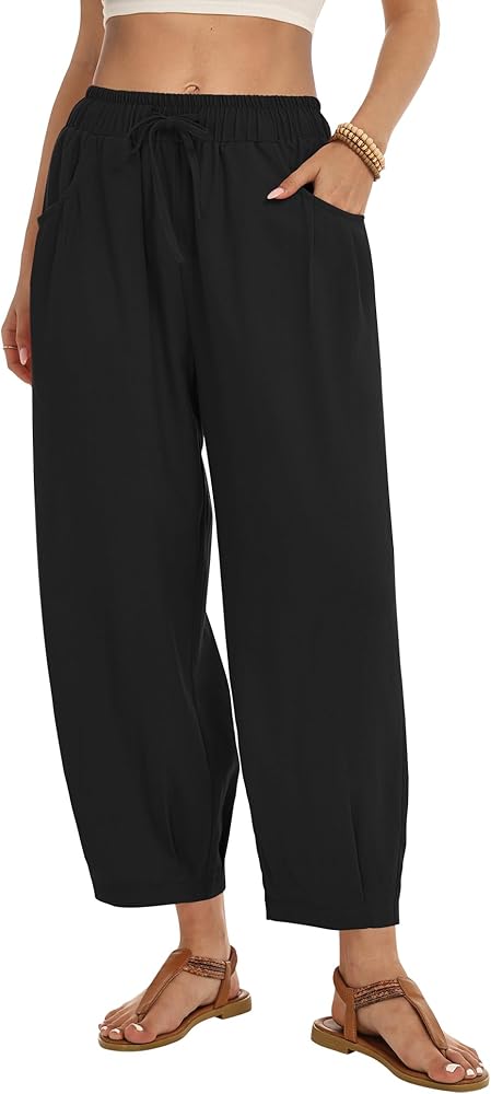 This womens linen pants are crafted from a soft, breathable linen cotton blend, which is skin friendly and lightweight. It keeps you cool and comfortable even on hot days. The loose harem pants with an elastic waistband and drawstring, combined with a wide leg design, easy to fit all body types. Tapered design cinches the cuffs, giving a sleek silhouette and avoids bulkiness. Side pockets for small items. Wide leg palazzo pants that balance practicality and fashion, paired with cropped tops and sandals for a beach vacation style or with long sleeve tops and sneakers for a casual style, and feature a loose fit for all day comfort. Flowy barrel pants perfect for daily life, such as vacations, beach, casual, home, dance, yoga, jogging, hiking, shopping, and outings. To keep the good condition of linen pants, it is recommended to gently machine wash or hand wash. Hang to dry in shaded.Do not bleach, wash light and dark colors separately to prevent color mixing.