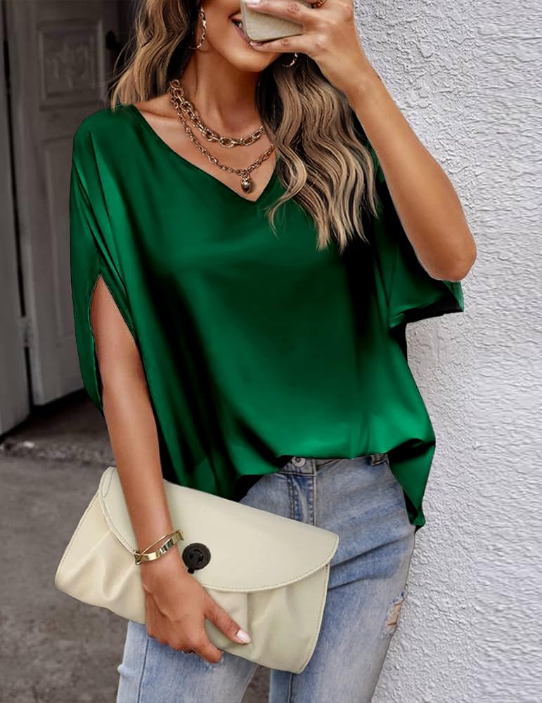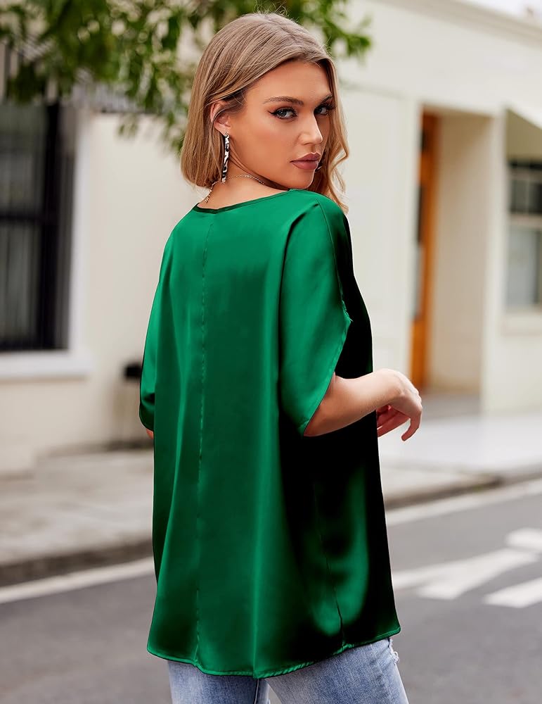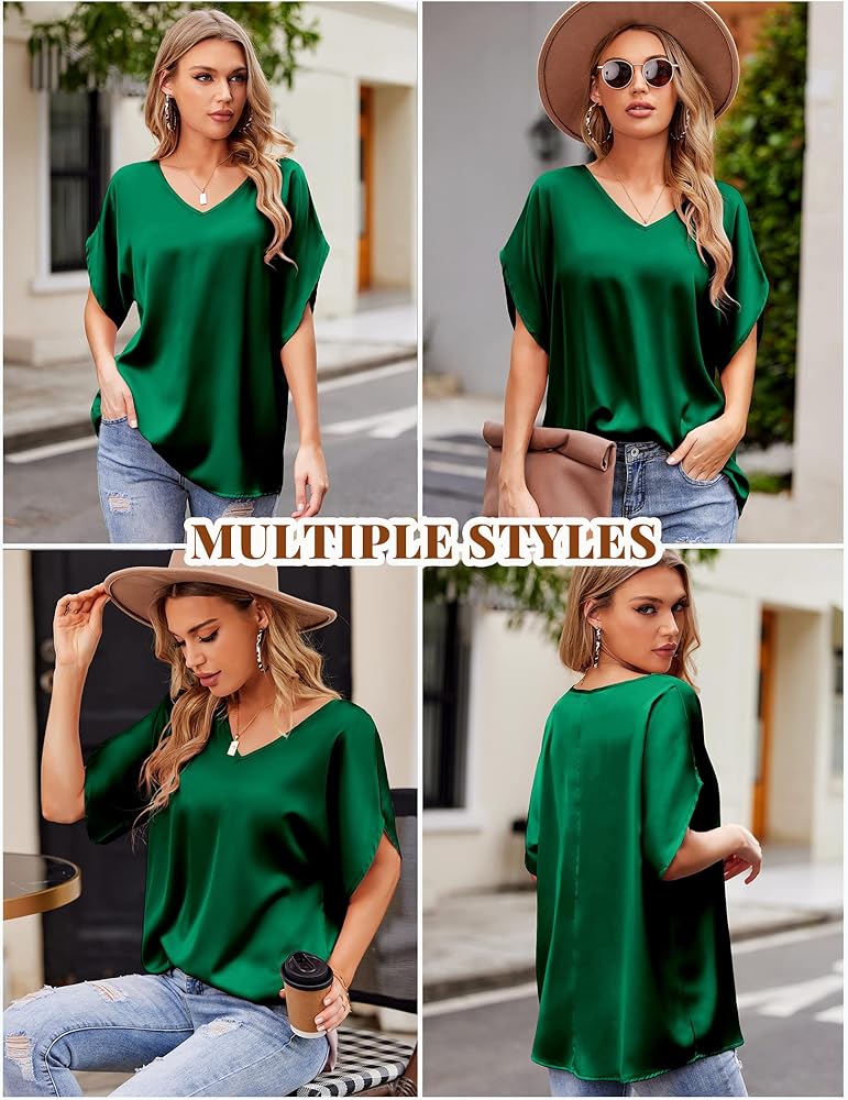 تصميم أنيق - قمصان حريرية بتصميم مثير برقبة على شكل حرف V، يمكنها إظهار خط رقبتك المثير بشكل أفضل. قميص نصف كم على شكل جناح الخفاش وتصميم من الساتان اللامع يجعل هذه البلوزة أكثر مثالية لإظهار سحرك وشكلك المثالي. تحتاج جميع خزائن السيدات إلى مثل هذا التصميم الأساسي غير الرسمي جزء علوي ملون، يسهل تنسيقه مع ملابسك اليومية.