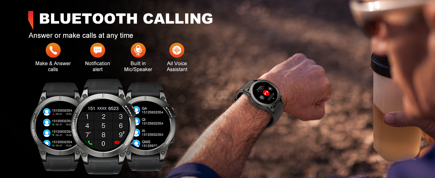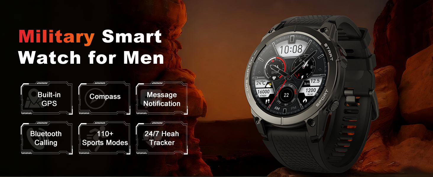 ساعة تتبع الأنشطة ذات المتانة العسكرية: تم تصميم الساعات الذكية العسكرية للرجال لتحمل أصعب الظروف، وتفي بالمعايير العسكرية لدرجات الحرارة القصوى والضغط المنخفض ومقاومة الغبار. هذه الساعة الرقمية للرجال مصنوعة من سبائك الزنك القوية مع تشطيب مطلي بالفراغ، كما أنها مقاومة للماء ومصممة لمقاومة التآكل. توفر شاشة اللمس AMOLED HD مقاس 1.43 بوصة رؤية واضحة في جميع البيئات، وتدعم ساعة النوم لغات متعددة للمستخدمين العالميين.