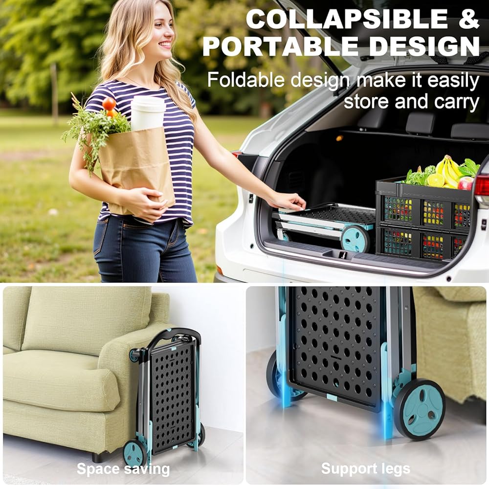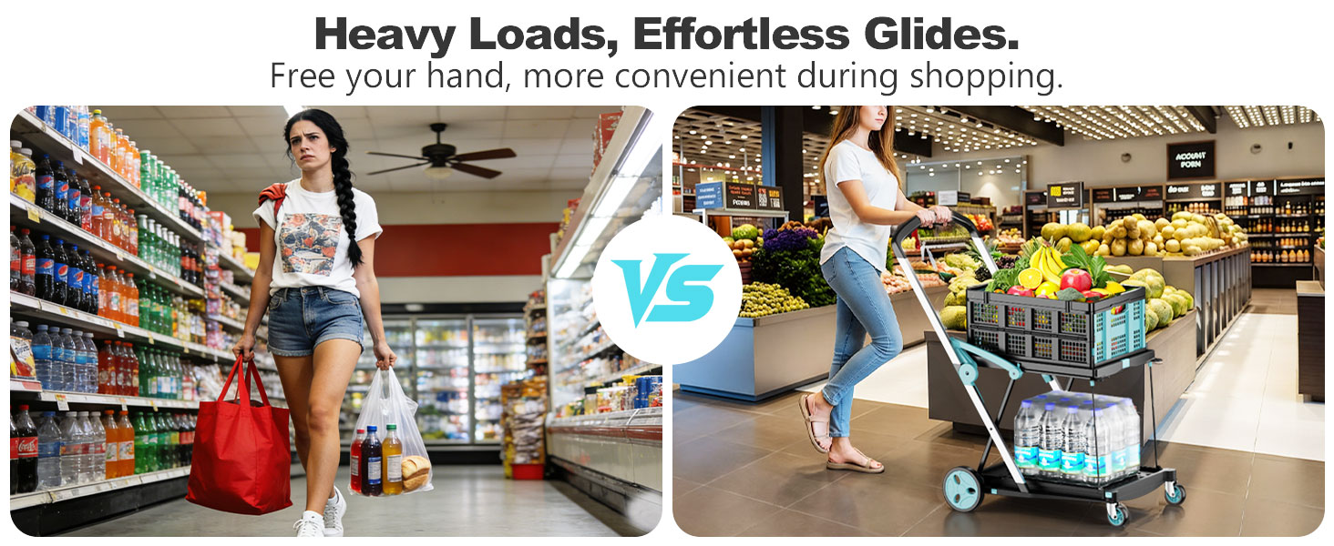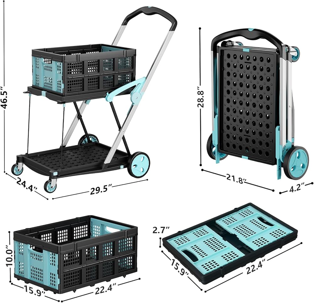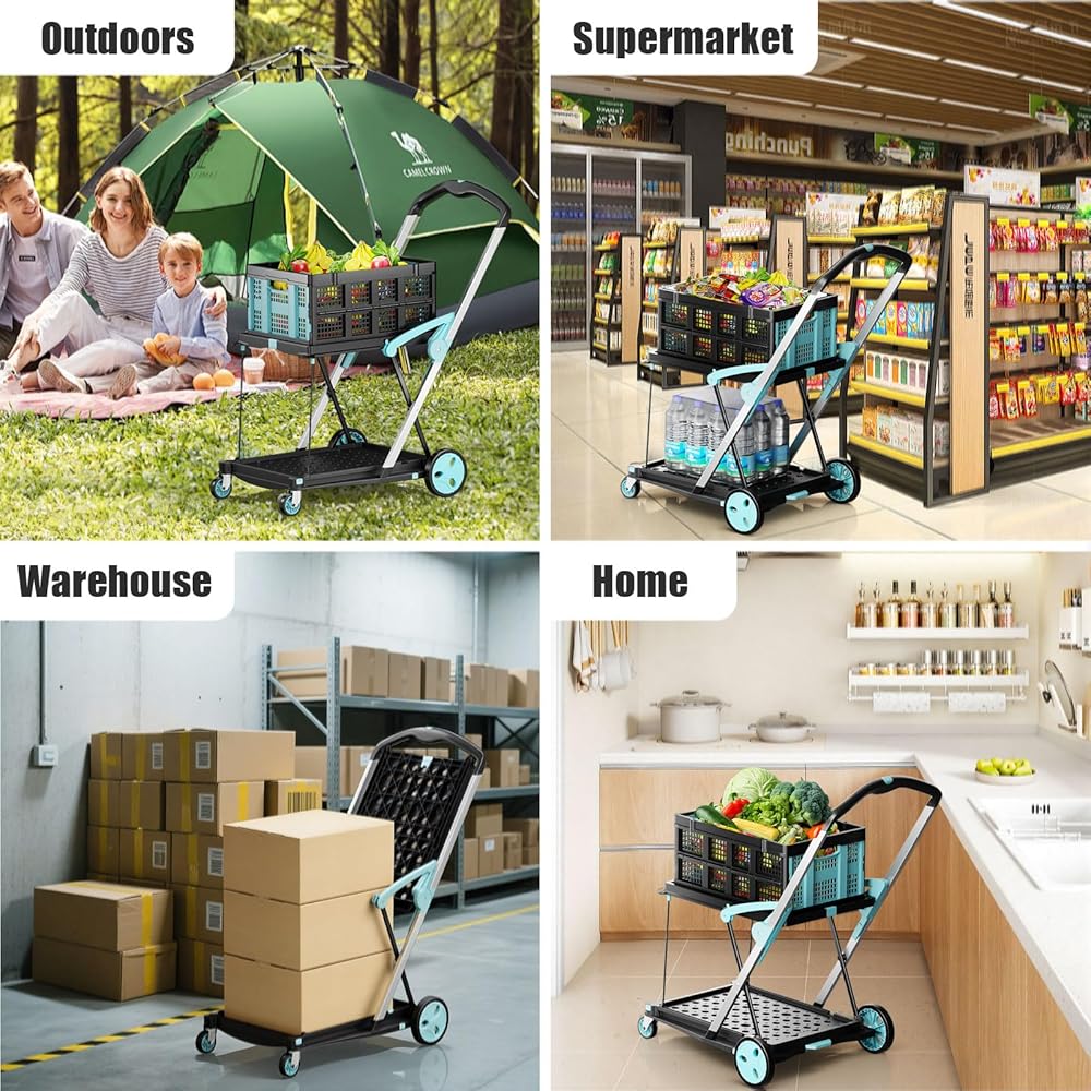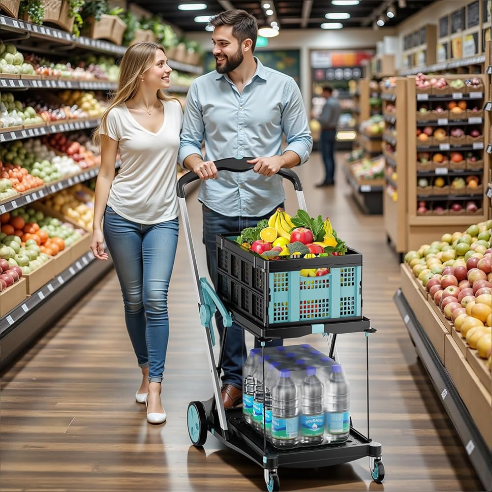 سلال قابلة للطي وقابلة للفصل: تأتي عربة التسوق القابلة للطي مع سلتين قابلتين للطي من البولي بروبيلين قابلة للفصل لتخزين العناصر المتناثرة (الفواكه والوجبات الخفيفة والأدوات الصغيرة). يمكن طي السلال بشكل مسطح في ثوانٍ بدون أدوات. يمكن استخدامها بمفردها أو مع العربة، مما يعزز التطبيق العملي.