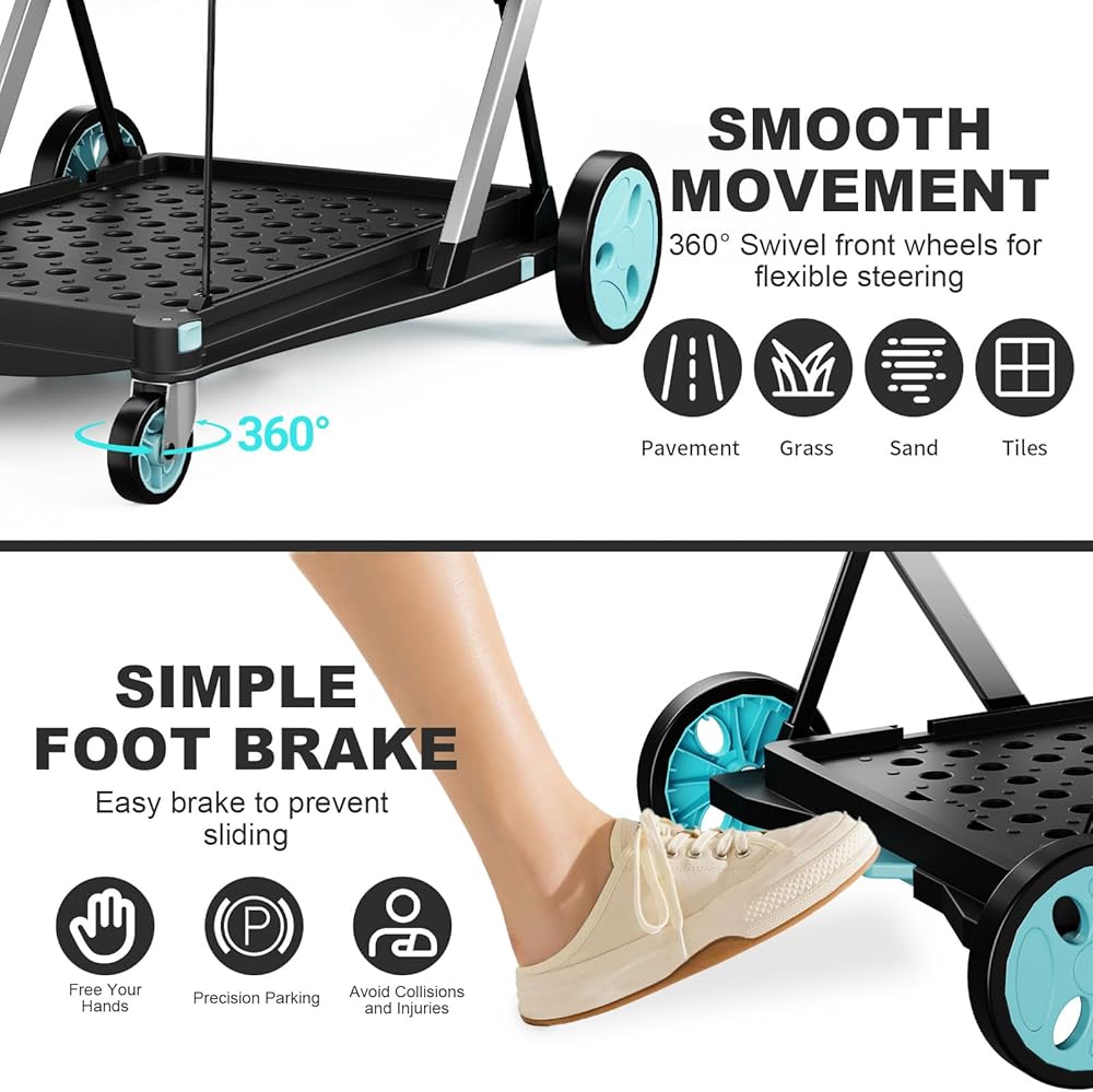 عجلات مرنة 360 درجة: 4 عجلات عالمية مع وظيفة دوران 360 درجة تزود العربة الدوارة بحركة مرنة في أي اتجاه. تعمل العجلات بهدوء وتوفر حماية للأرضية (بدون خدوش). العجلات الخلفية مع فرامل القدم: اضغط على الدواسة لقفل عربة التسوق القابلة للطي بالعجلات على الفور، مما يجعلها آمنة للتحميل/التفريغ.