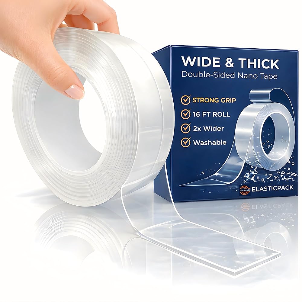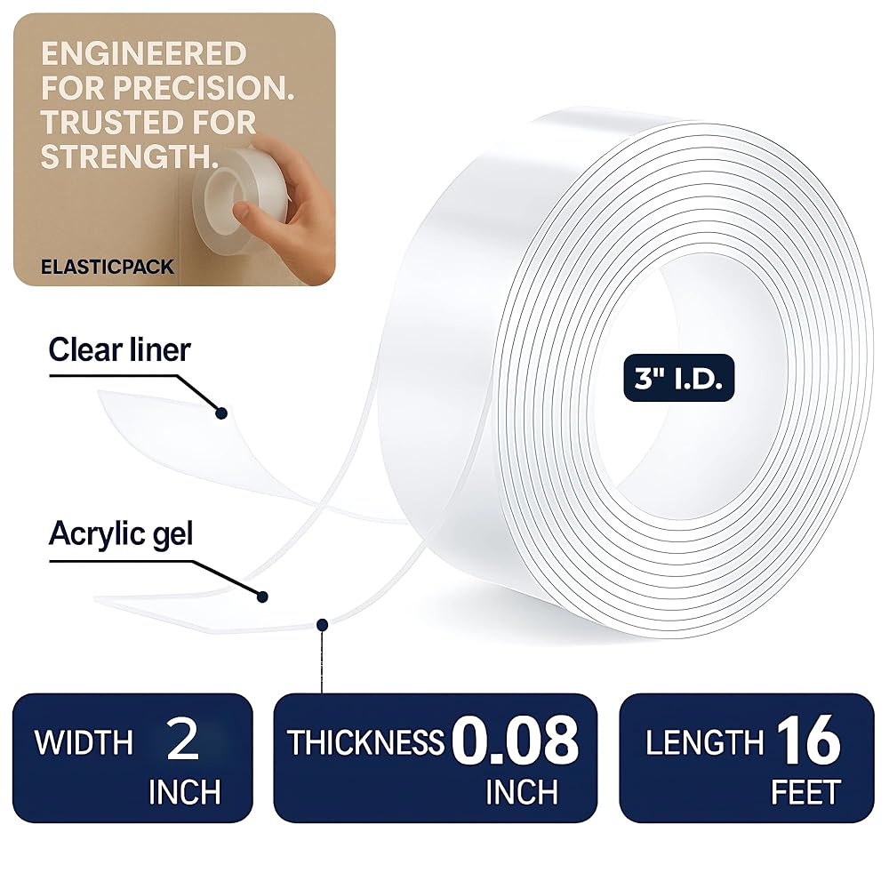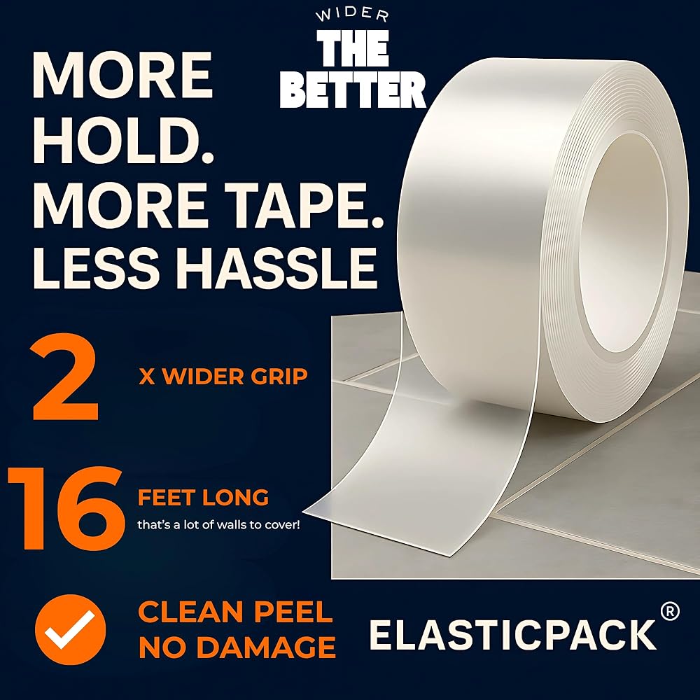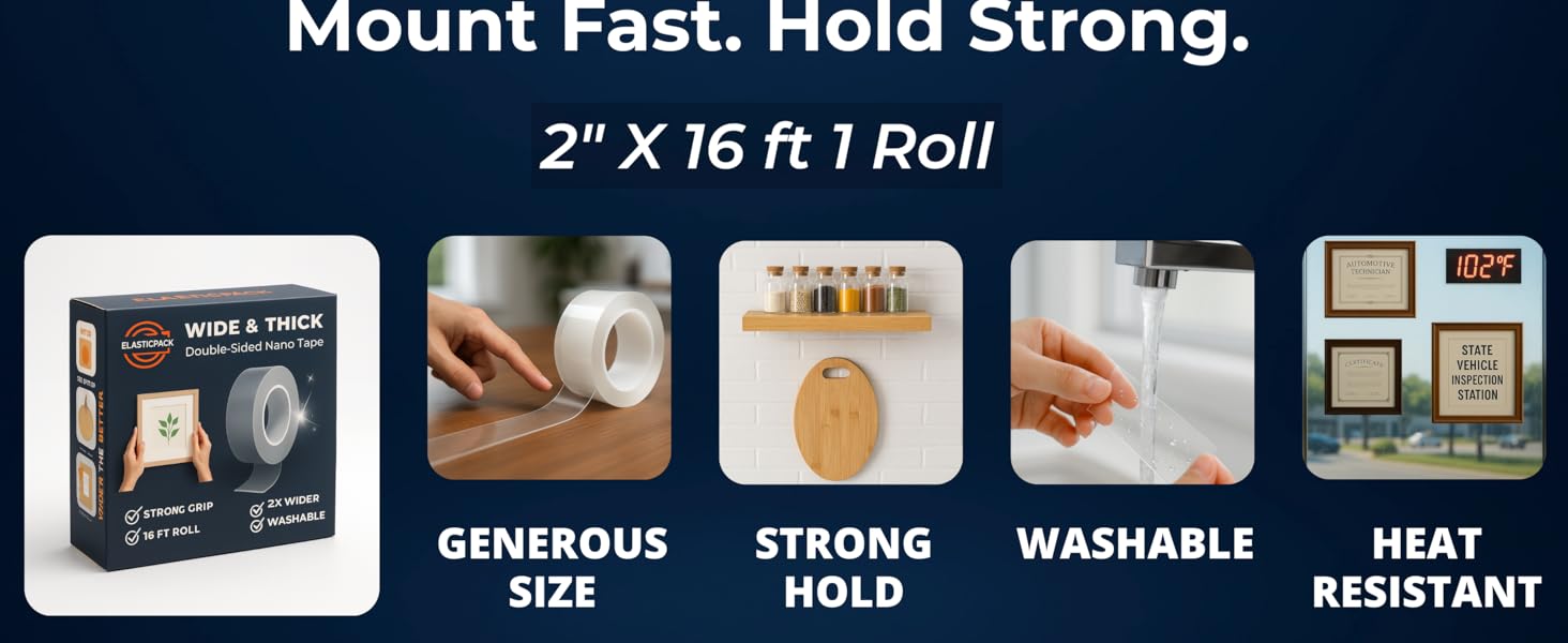 ✅ شريط مزدوج الجوانب عالي التحمل - لفة عريضة للغاية وطويلة 2 بوصة × 16 قدم بسمك 2 مم توفر قبضة قوية للجدران والخطافات والسجاد والحرف اليدوية والديكور بدون مسامير أو براغي.