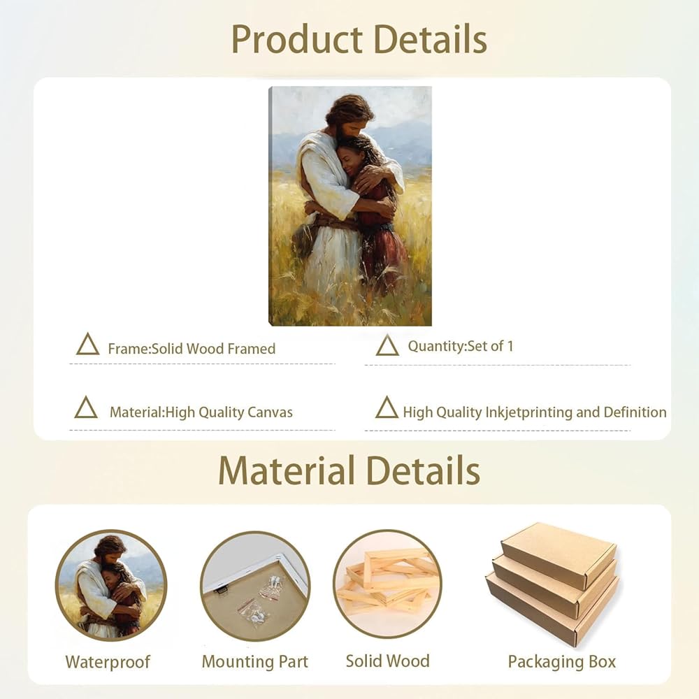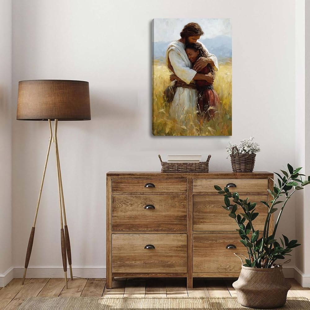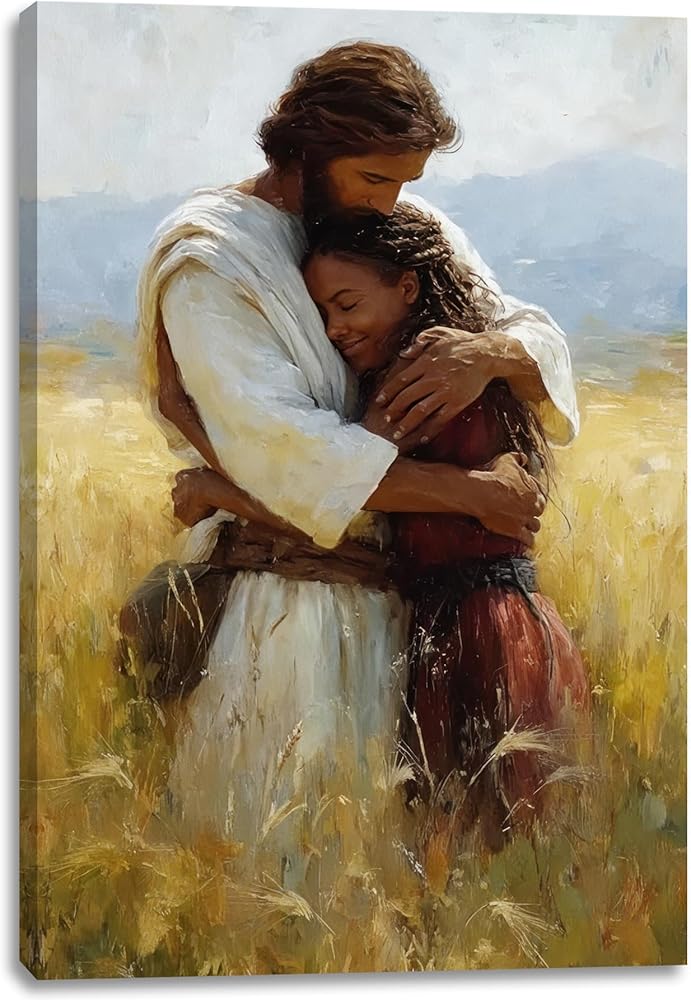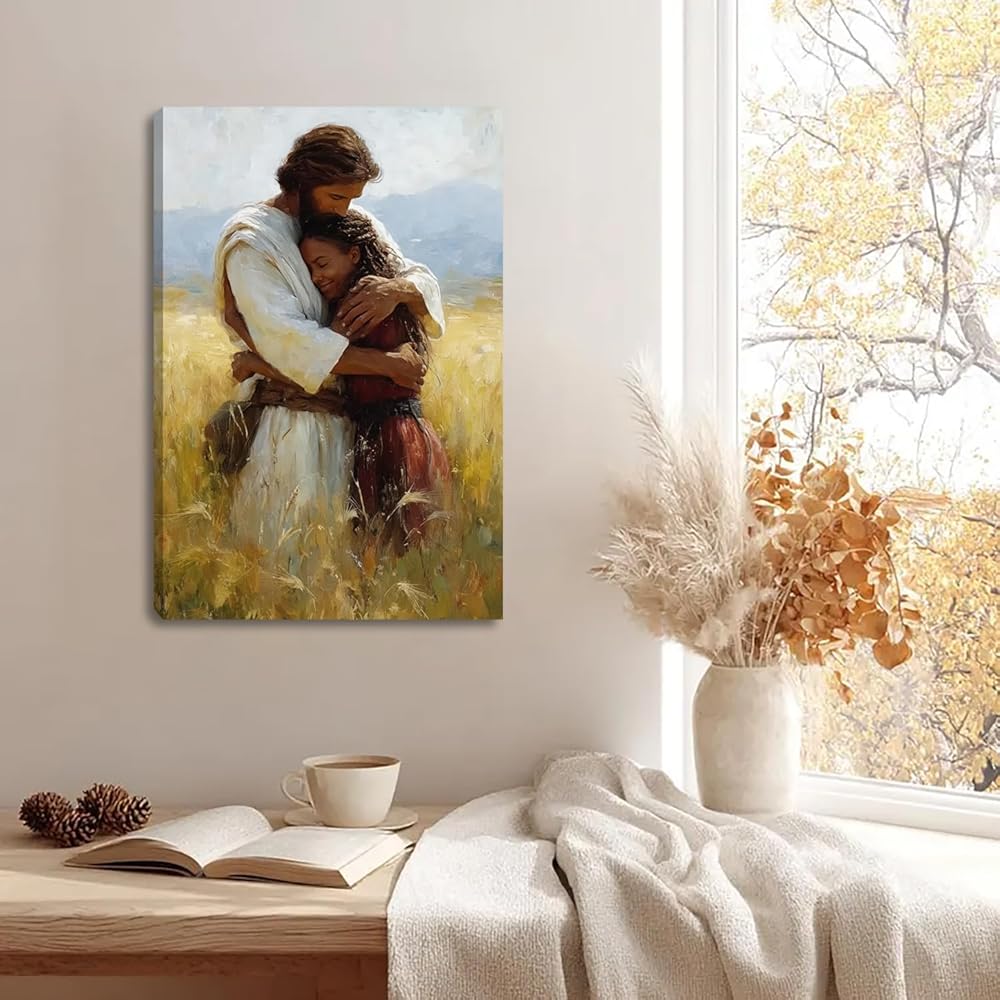 【Jesus Embracing Black Women Wall Art】: The Jesus (2D No Texture) Picture size is 12x16 inches (Stretched Canvas on a Wooden Frame). The warm yellow backdrop of wheat fields and the relaxed embrace create a serene atmosphere of “acceptance and healing.” This piece fulfills the spiritual comfort needs of religious believers while infusing home spaces with peace and strength, alleviating daily anxieties.