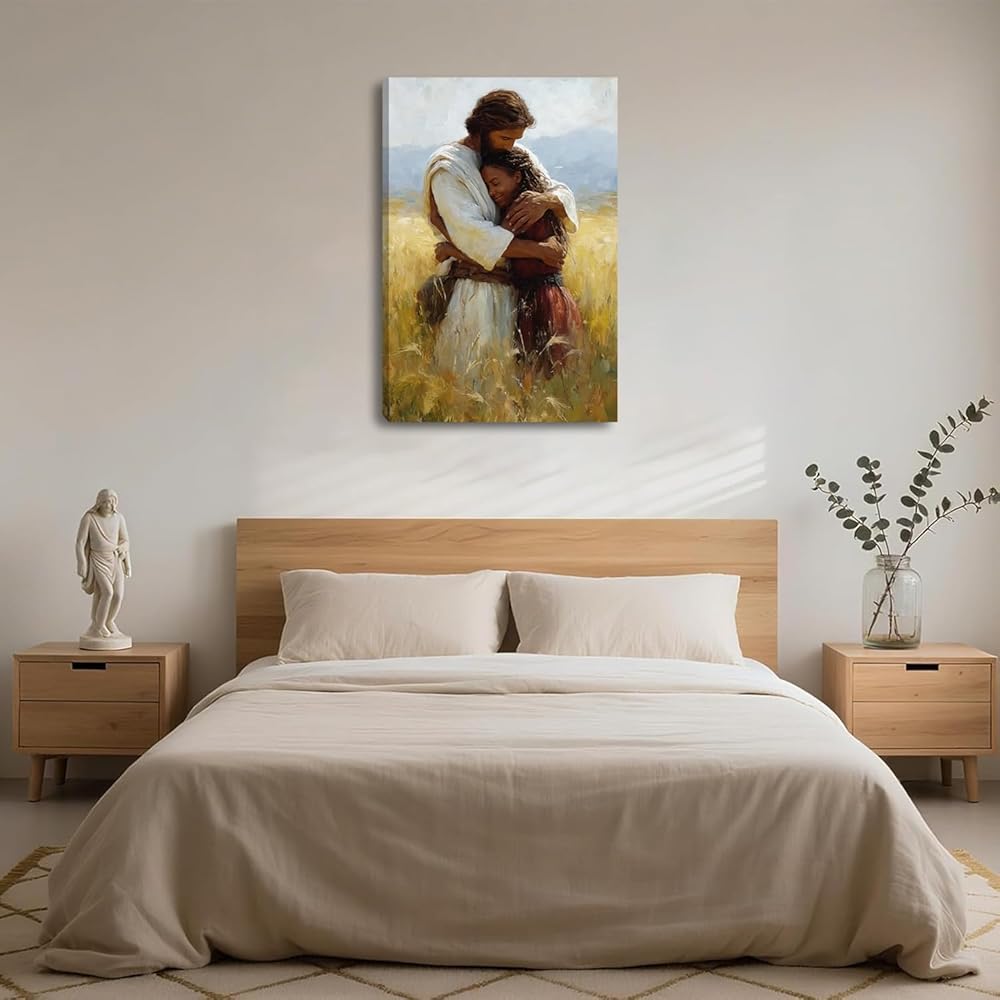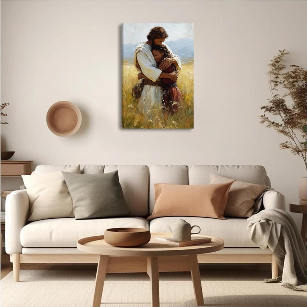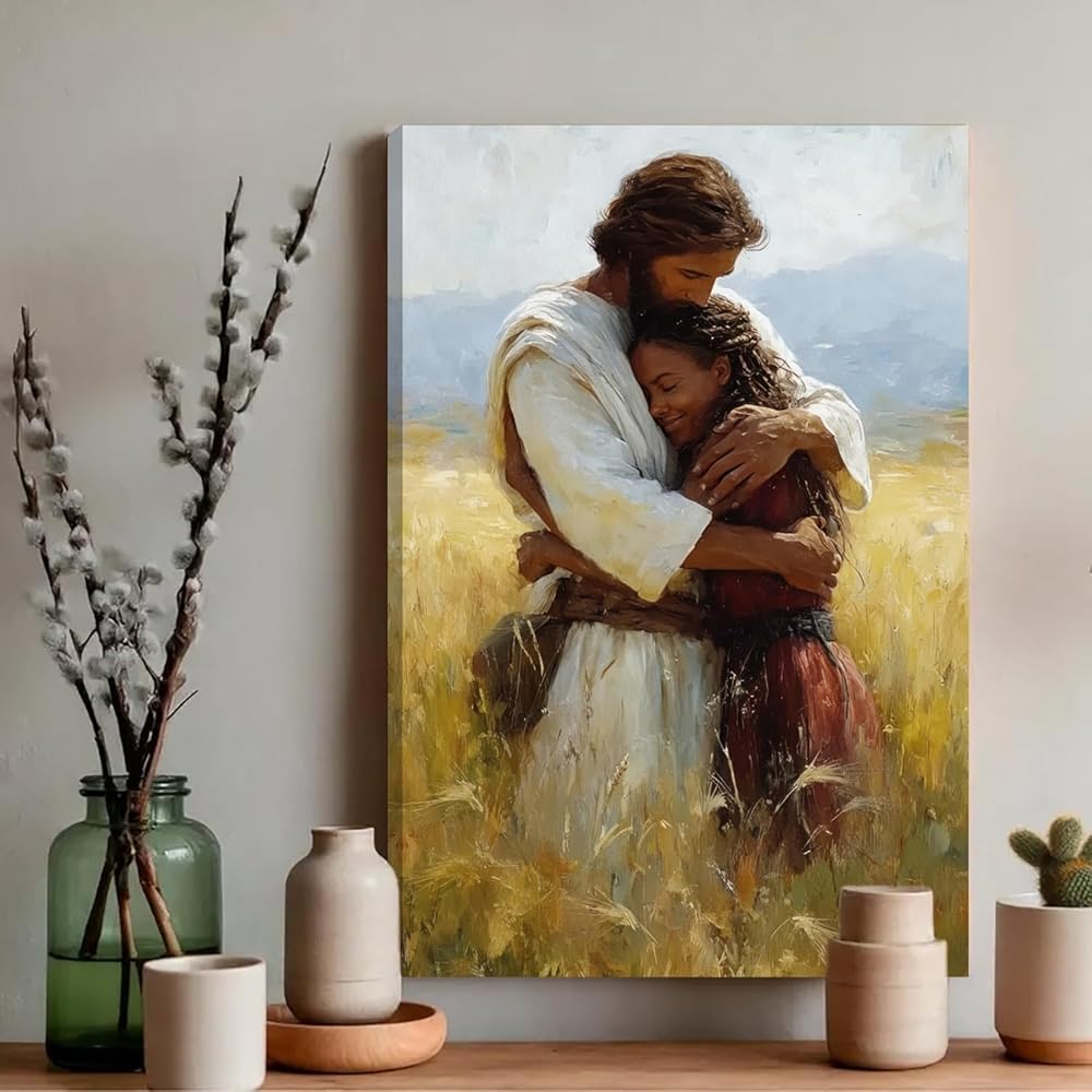 【Jesus Embracing Black Women Wall Art】: The Jesus (2D No Texture) Picture size is 12x16 inches (Stretched Canvas on a Wooden Frame). The warm yellow backdrop of wheat fields and the relaxed embrace create a serene atmosphere of “acceptance and healing.” This piece fulfills the spiritual comfort needs of religious believers while infusing home spaces with peace and strength, alleviating daily anxieties.