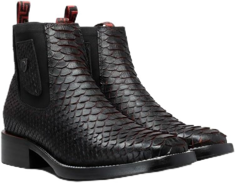 Step into confidence and style with the Joe Boots Men's Python Embossed Chelsea Boot. Expertly handcrafted from genuine leather with a bold python-embossed finish, this boot captures the perfect balance between rugged durability and refined sophistication. Designed for men who appreciate Western tradition with a modern edge, it delivers a standout look from ranch days to night outings. Built with comfort and precision in mind, the elastic side panels ensure an easy slip-on fit, while the leather lining and cushioned insole provide all-day comfort. The distinctive red sole and hand-stitched welt showcase Joe Boots' commitment to authentic craftsmanship and attention to detail.