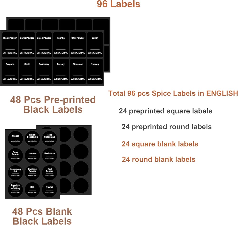 - Total 96 pcs 𝐬𝐩𝐢𝐜𝐞 𝐥𝐚𝐛𝐞𝐥𝐬 𝐢𝐧 ENGLISH - 24 𝐩𝐫𝐞𝐩𝐫𝐢𝐧𝐭𝐞𝐝 𝐬𝐪𝐮𝐚𝐫𝐞 𝐥𝐚𝐛𝐞𝐥𝐬, 24 𝐩𝐫𝐞𝐩𝐫𝐢𝐧𝐭𝐞𝐝 𝐫𝐨𝐮𝐧𝐝 𝐥𝐚𝐛𝐞𝐥𝐬, 24 𝐬𝐪𝐮𝐚𝐫𝐞 𝐛𝐥𝐚𝐧𝐤 𝐥𝐚𝐛𝐞𝐥𝐬, 24 𝐫𝐨𝐮𝐧𝐝 𝐛𝐥𝐚𝐧𝐤 𝐥𝐚𝐛𝐞𝐥𝐬. (Jars NOT Included)