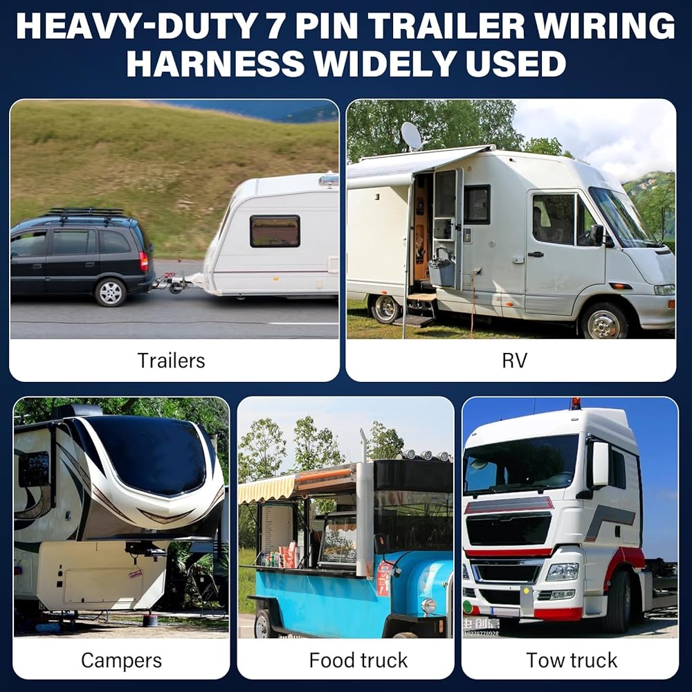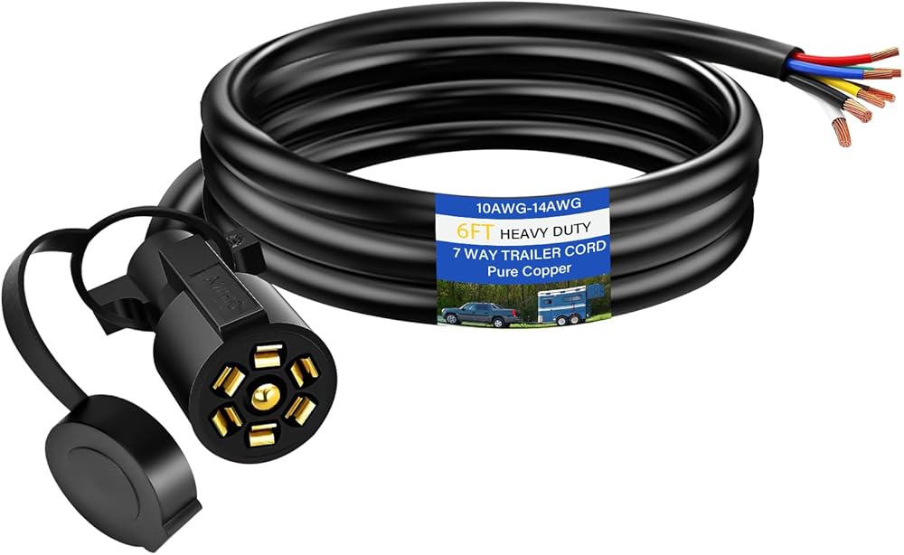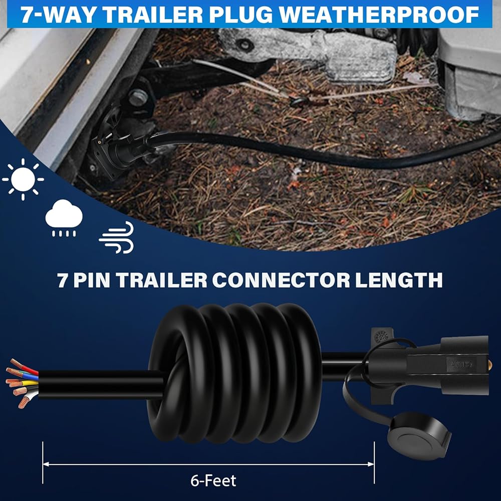 7 PRONG TRAILER PLUG EASY TO USE: Heavy-duty 7 wire trailer plug with 7 Color coded wires, easily identified convenient wiring. 6 feet long trailer cord that offers you plenty of flexibility to wire it from the front to the rear of your car. convenience for brake signal lamp, reverse light, tail light, wiring left/right turn light. Make sure the trailer line is of the correct length for proper installation