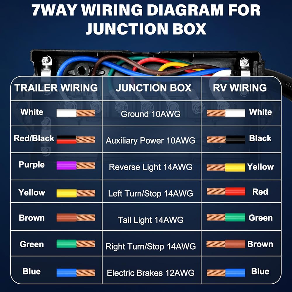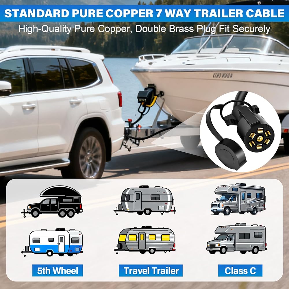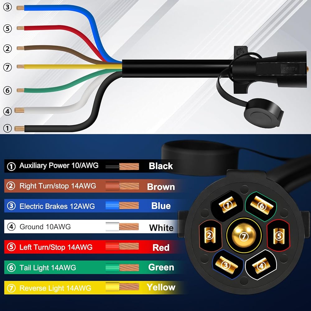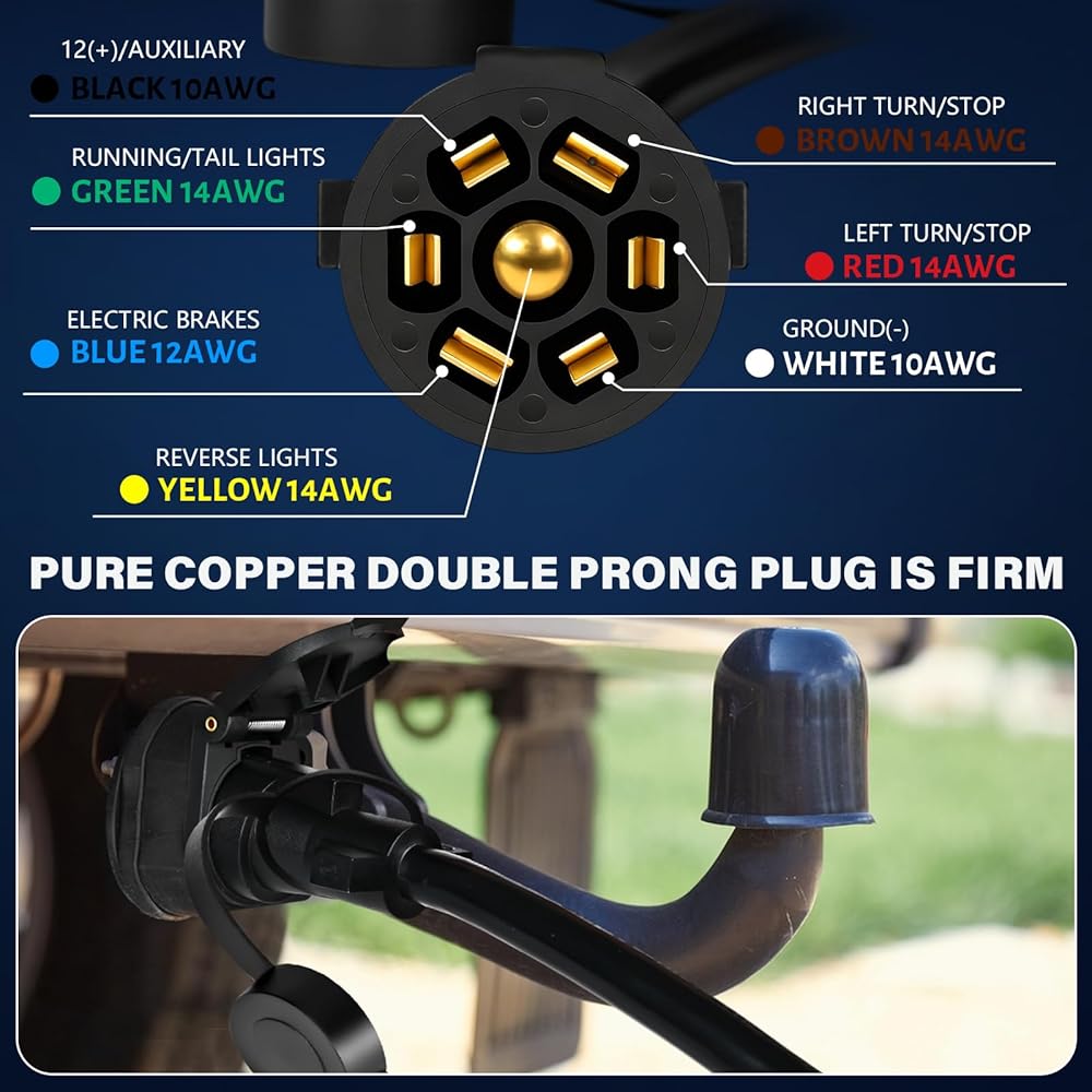 STABLE & DURABLE: This 7 pin trailer wiring harness built molded and made of 10awg-12awg-14awg standard pure copper wire, coated with a heavy duty pvc, serves as protection from outdoor elements, wear and tear.trailer 7 pin plug connector maximum temperature resistance: 105 degrees celsius, Maximum withstand voltage: 300V, Pure copper plug wire for superior conductivity