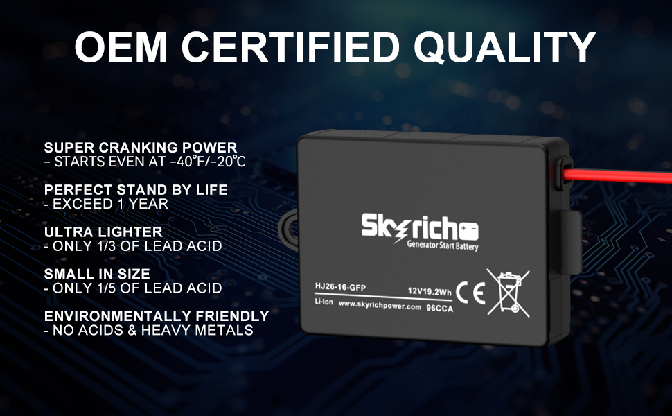 طاقة بدء موثوقة بقدرة 12 فولت: توفر طاقة تبلغ 1.6 أمبير (19.2 واط في الساعة) مع حماية ضد الشحن الزائد والتفريغ الزائد، مما يضمن تشغيل المحرك بشكل موثوق وعمر بطارية ممتد.