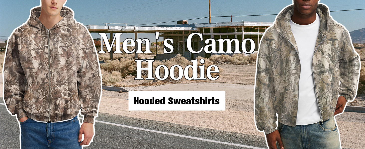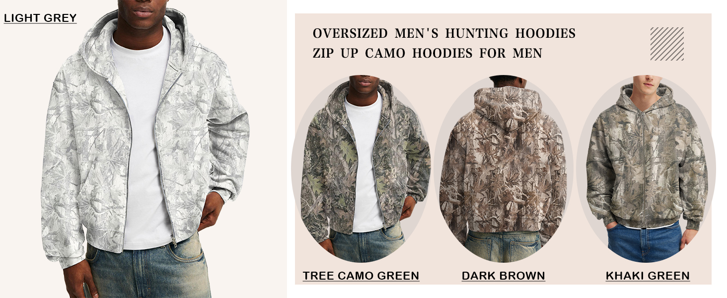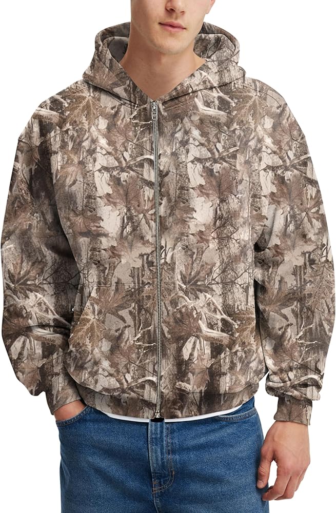 VERSATILE STYLE: Maple leaf prints hunting hoodie, oversized camo zipper hooded sweatshirts are easy to pair with different bottoms. With jeans for casual look, with cargo pants to enhance the outdoor-inspired aesthetic. This men camo hoodie can be layered under a heavier jacket in colder winter weather or worn alone during fall