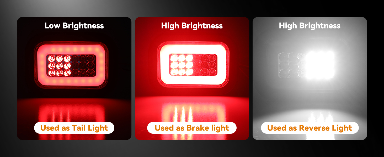 سطوع متميز: تحتوي كل مصابيح خلفية للمقطورة على 42 قطعة 2835 خرزة LED، 24 قطعة تحت الحلقات الخارجية الحمراء + 9 قطع خرزات الضوء الأبيض + 9 قطع خرزات الضوء الأحمر. الحلقة الخارجية الحمراء متناثرة (لا يمكن رؤية خرزات LED)، الضوء ليس مبهرًا، والذي يبدو عصريًا وفريدًا من نوعه.