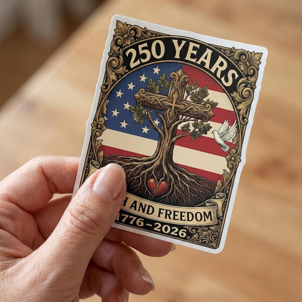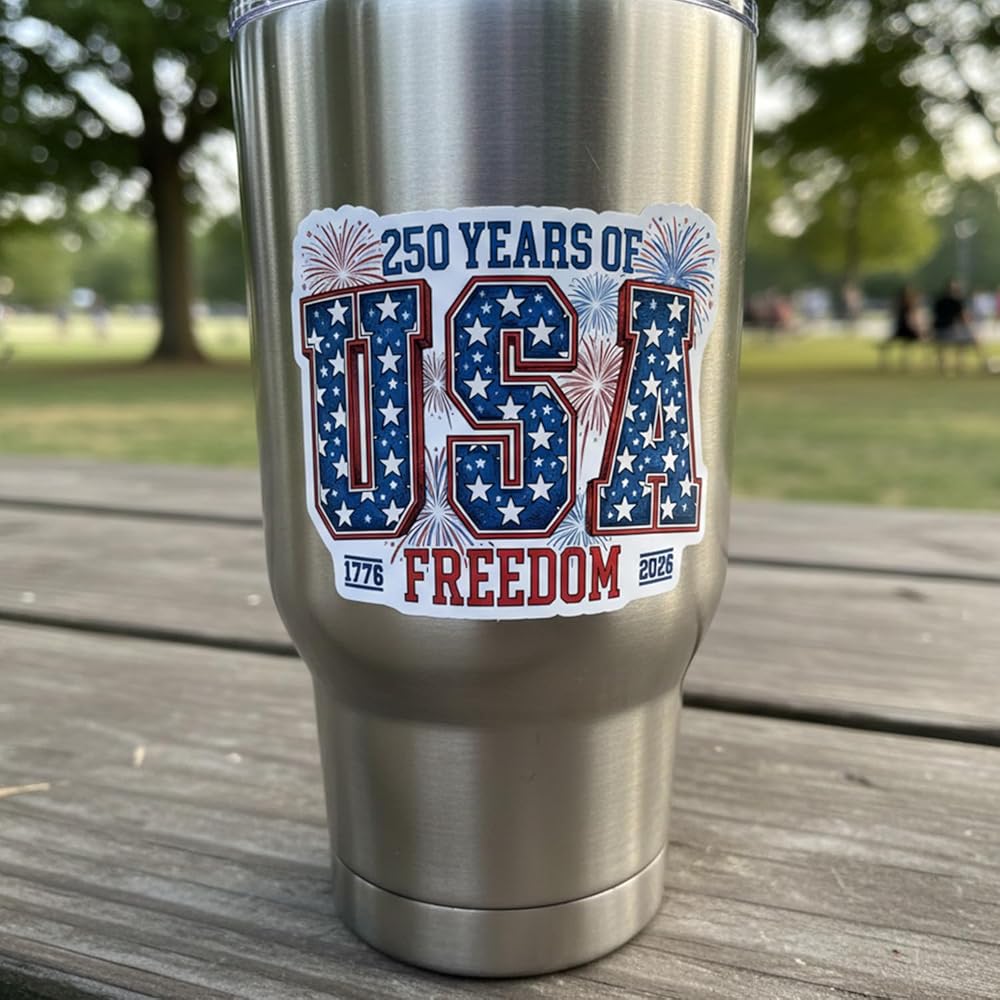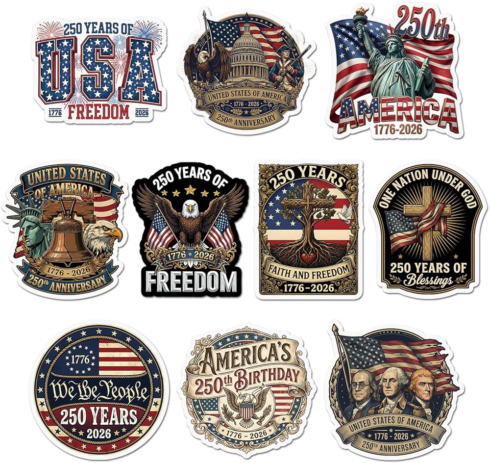 Celebrate America's 250th anniversary with these premium vinyl stickers commemorating this historic milestone from 1776 to 2026. Each patriotic design features iconic American symbols including the Statue of Liberty, bald eagle, American flag, and Capitol building, beautifully rendered in rich red, white, and blue colors with vintage-inspired details. These waterproof and UV-resistant stickers measure approximately 2.5 to 3 inches and are perfect for personalizing water bottles, laptops, planners, or any smooth surface. The high-quality vinyl construction ensures durability while the die-cut shape provides a clean, professional look. Easy to apply and built to last, these stickers feature detailed artwork celebrating themes of freedom, faith, and the American spirit. The collection includes multiple unique designs that capture 250 years of American heritage, making them ideal for showing your patriotic pride during this momentous anniversary celebration. Each sticker is individually crafted with a glossy finish that enhances the vibrant artwork while providing protection against everyday wear.