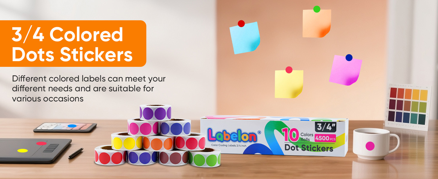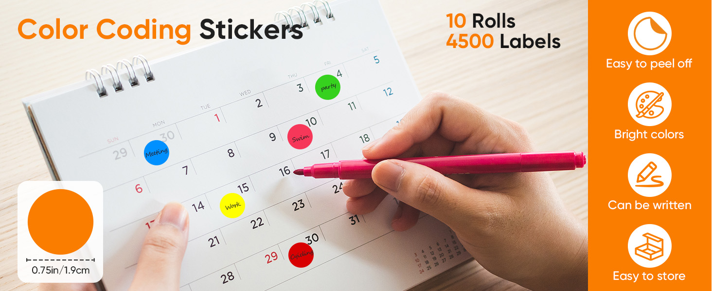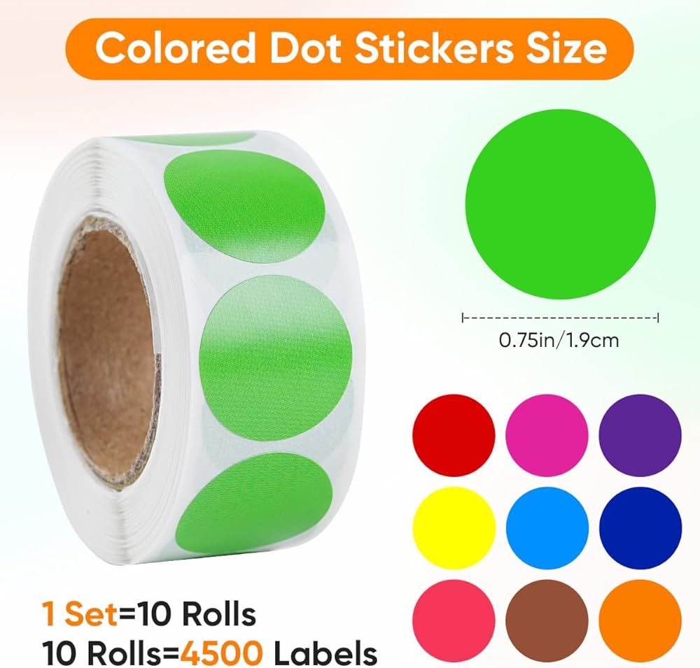 مجموعة ملصقات منقطة ملونة (بما في ذلك صندوق التخزين): يحتوي كل صندوق على 4500 ملصق دائري ملون قابل للإزالة، كل منها بقطر 3/4 بوصة، و10 ملصقات مختلفة لترميز الألوان (أحمر، أحمر وردي، أرجواني، أصفر، أخضر، أزرق سماوي، وردي، بني، برتقالي، أزرق داكن). مصممة بصندوق تخزين، يمكن الوصول بسهولة إلى الملصقات المرمزة بالألوان للاستخدام.