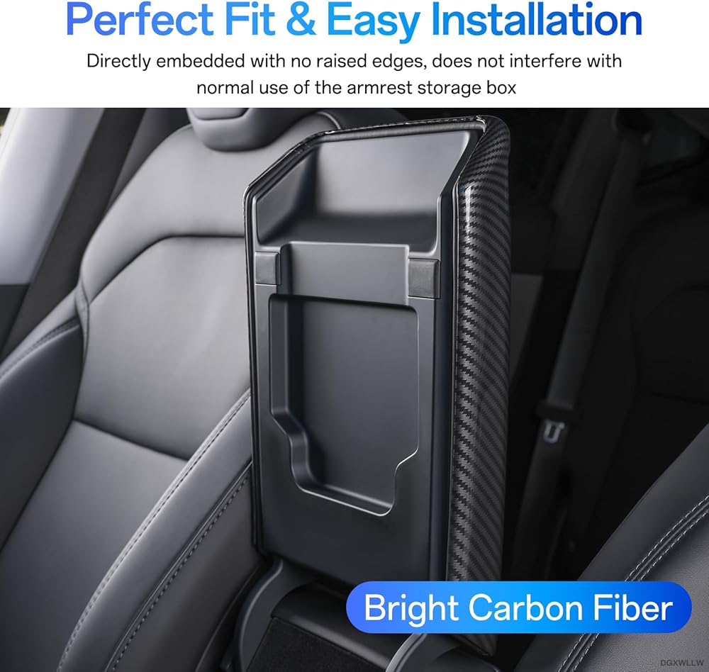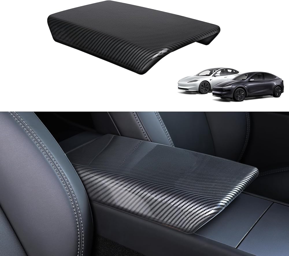 غطاء مسند ذراع وحدة التحكم المركزية لسيارة Tesla Model Y Juniper 2026 2025 وModel 3 Highland 2026 2025 2024، أغطية مسند الذراع ملحقات داخلية لوحدة التحكم، ألياف الكربون الساطعة