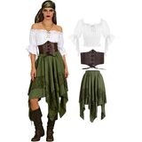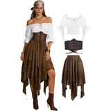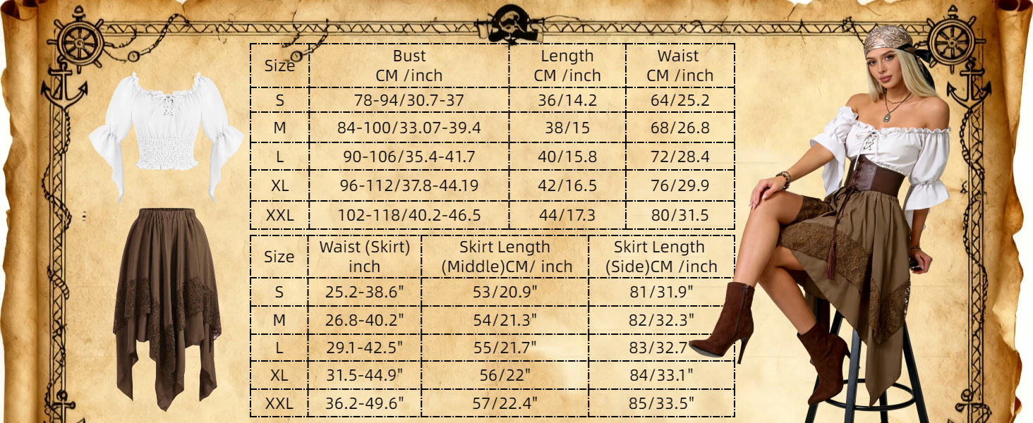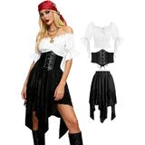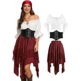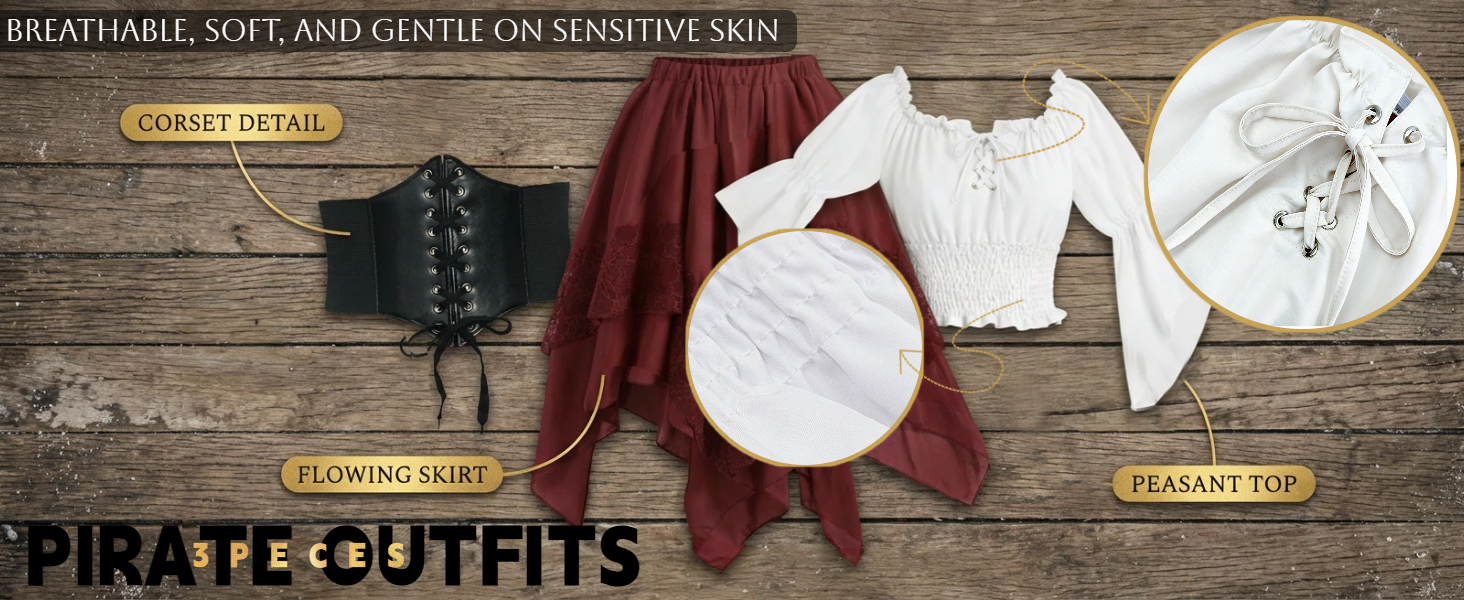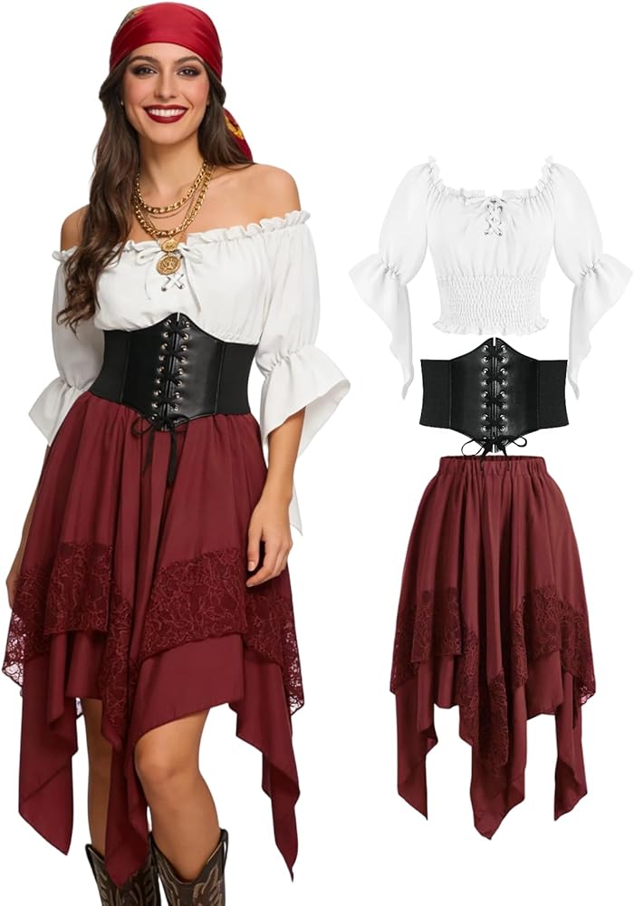 مجموعة أزياء القرصان الكاملة: يتضمن زي القرصان النسائي هذا قميصًا فلاحيًا أبيض بدون أكتاف بأكمام مكشكشة، ومشد أسود برباط أمامي، وتنورة ذات طبقات بورجوندي مع زخرفة من الدانتيل، ووشاح رأس مطابق (غير متضمن) للحصول على مظهر قرصان أصلي