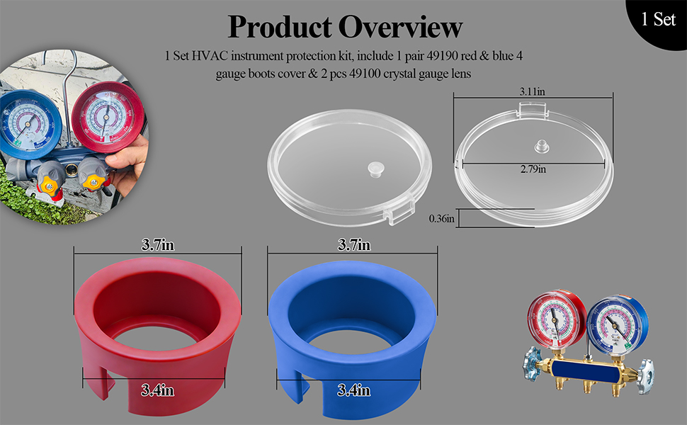 نظرة عامة على المنتج: مجموعة واحدة من أدوات حماية أدوات التدفئة والتهوية وتكييف الهواء (HVAC)، تتضمن زوجًا واحدًا من غطاء أحذية بمقياس أحمر وأزرق 49190 وقطعتين من عدسة قياس كريستال 49100