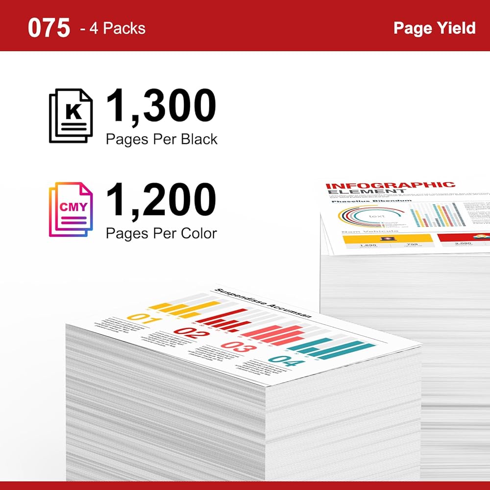 • تتضمن العبوة 4 خراطيش حبر 075: 075 أسود (6365C001)، 075 سماوي (‎6364C001)، 075 أصفر (6362C001)، 075 أرجواني (6363C001). مجموعة كاملة من التغليف المريح تجعل عملية الاستبدال أسهل والطباعة أكثر كفاءة.