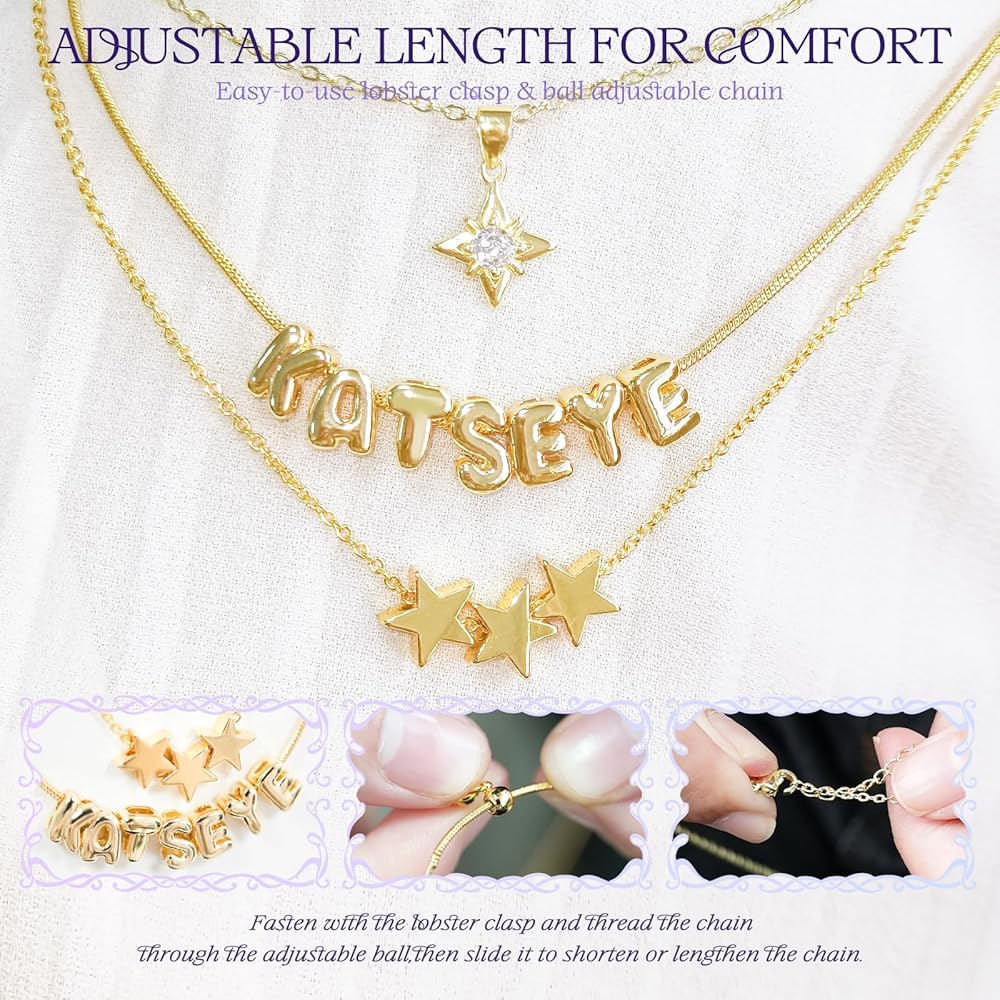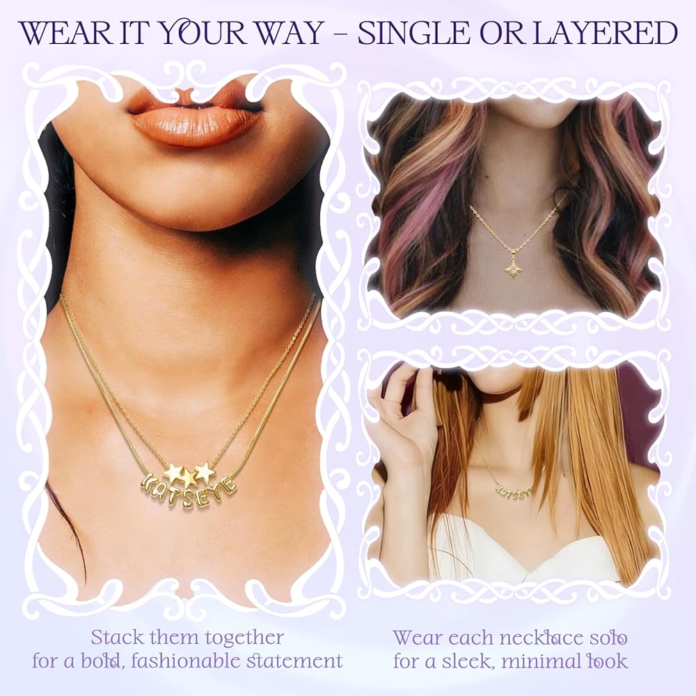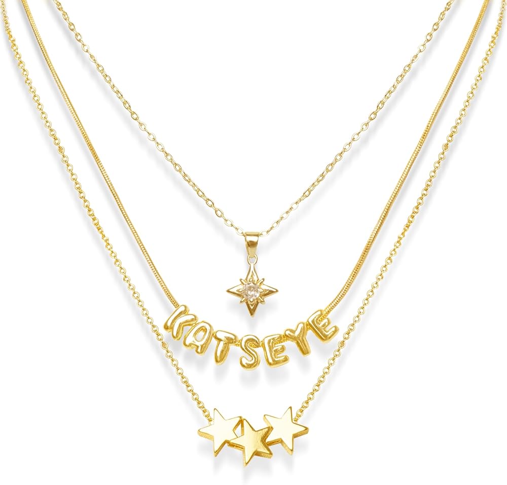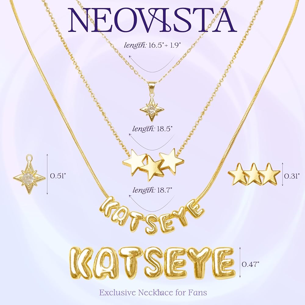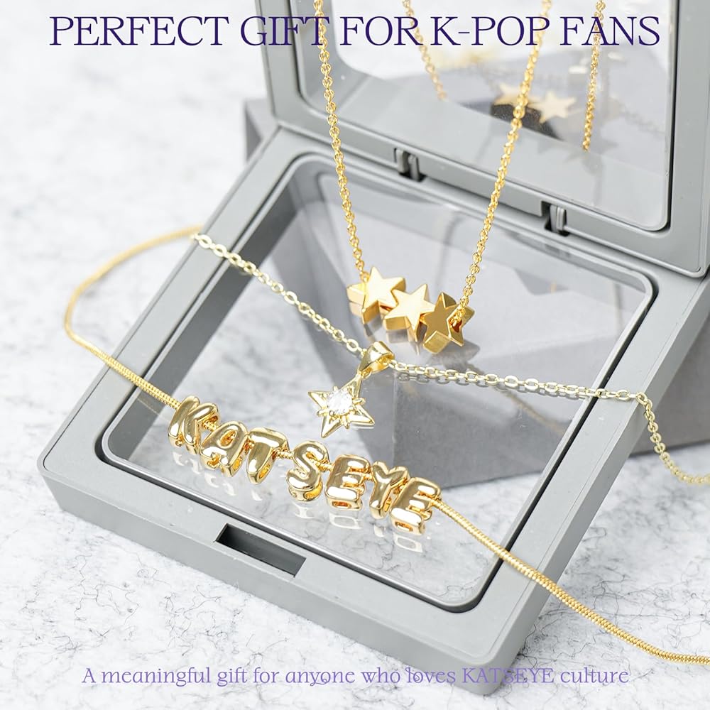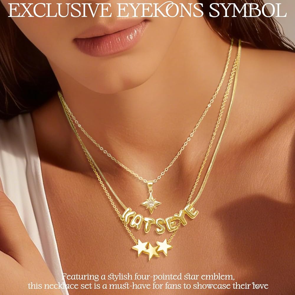 Necklace Set Designed for Katseye Fans - This set includes three gold necklaces inspired by Katseye, featuring a letter necklace, a three-star charm necklace, and a diamond star pendant necklace. Designed for fans who enjoy expressing their connection through subtle, wearable details. Please note that the 18K gold plating is applied only to the letter charms and the three smaller star charms, not to other parts of the necklaces.