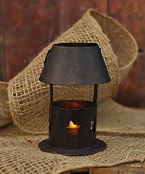A small tealight candle lantern that can be used anywhere in the home. A country accent that compliments any room. Perfect to add a rustic accent on a table, sideboard, mantle or bedside table or you can even hang it on a hook! The small tealight candle holder is black with stars in the base and a hanging wire adds a little more charm. 4-1/2 inches tall and 3 inches in diameter. Candle not included.