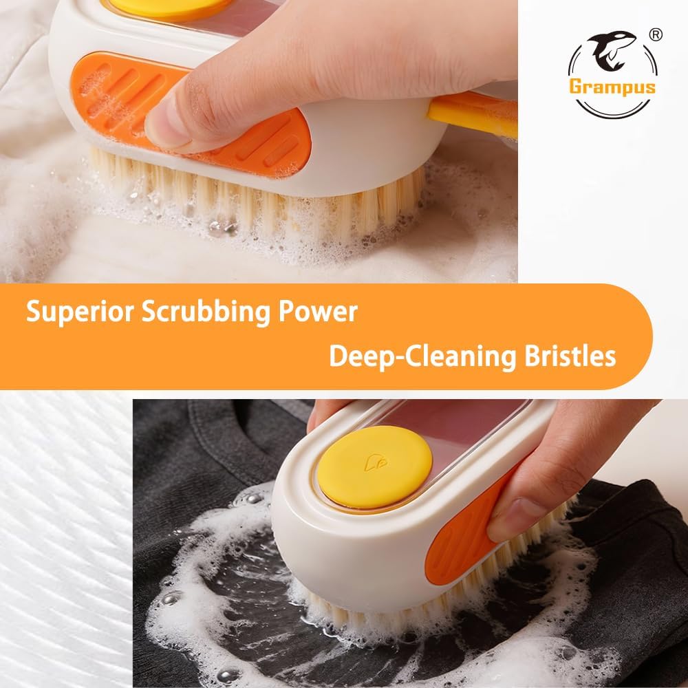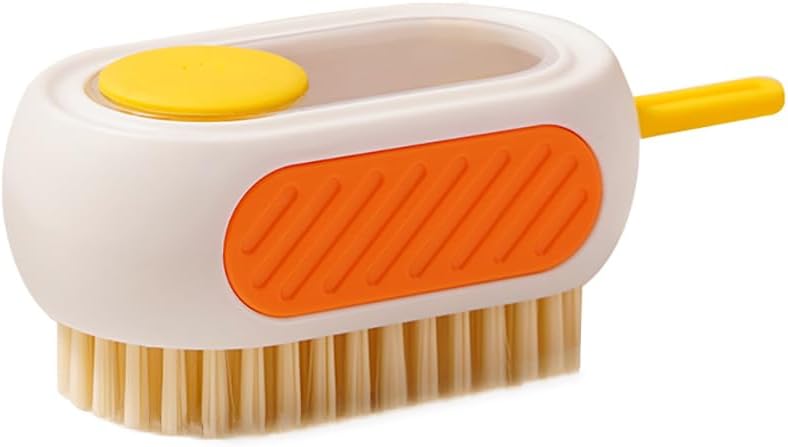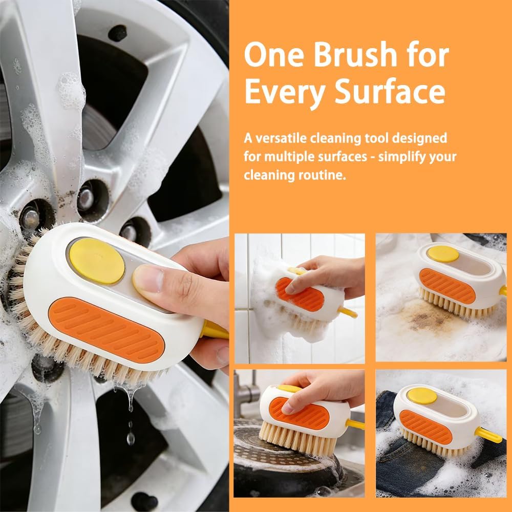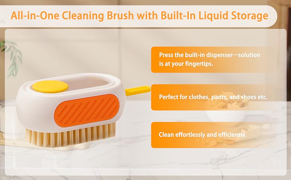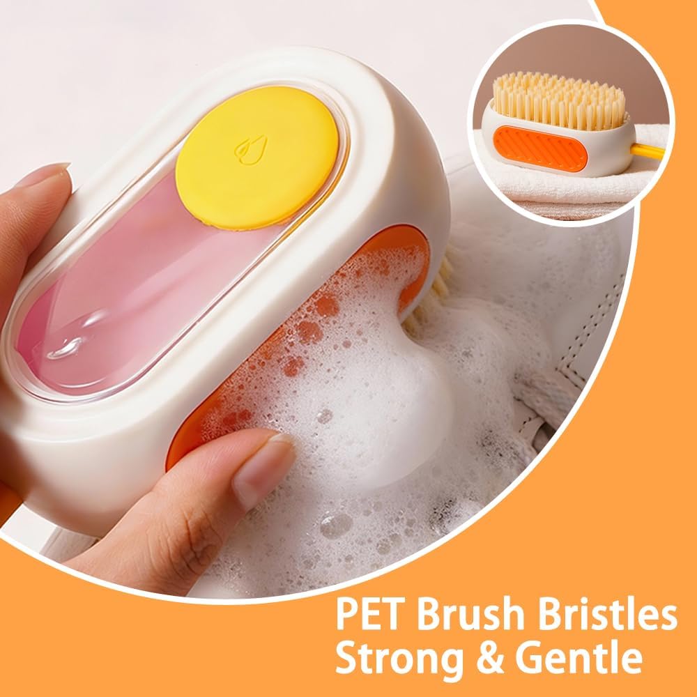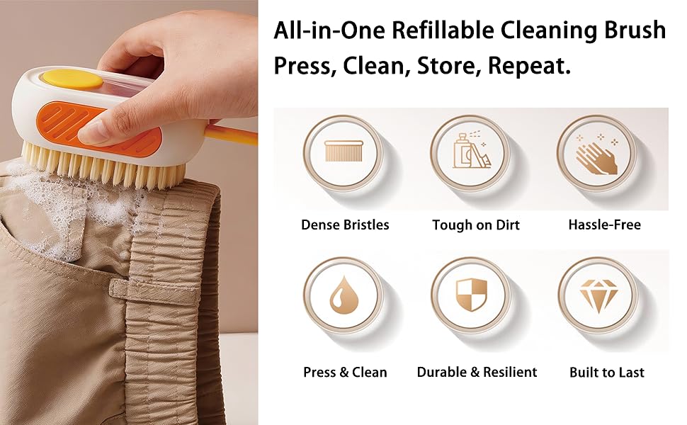 فرشاة تنظيف الكل في واحد قابلة لإعادة التعبئة مع خزان مدمج، اضغط لتوزيع المحلول لتنظيف الأسطح المتعددة: الملابس والأحذية والعجلات والمطبخ والحمام. شعيرات PET كثيفة وقابلة للتعليق، ذات سعة كبيرة