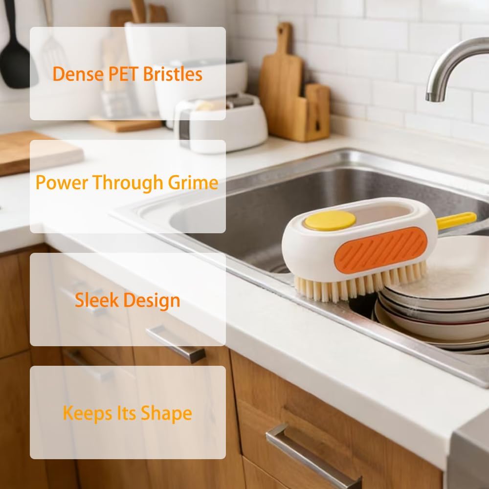 • تصميم سهل الضغط للتوزيع - ما عليك سوى الضغط على الزر الأصفر لتحرير محلول التنظيف بسلاسة (بدون غمس أو انسكاب يدوي!). تعمل شعيرات PET الكثيفة والمتينة على معالجة الأوساخ الصعبة والبقع والأوساخ دون خدش الأسطح - وهي مثالية للتنظيف العميق دون أي متاعب.