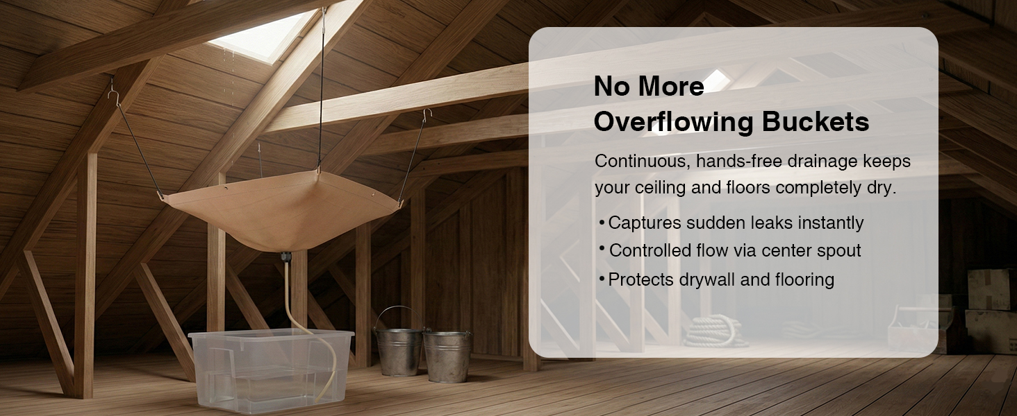 إنهاء إفراغ الدلو الذي لا نهاية له: النوم بشكل سليم طوال الليل. بدلاً من وضع دلاء متعددة على الأرض والاستيقاظ باستمرار لتفريغها، تقوم هذه المظلة على شكل قمع بتوجيه كل قطرة إلى نقطة تصريف واحدة. استمتع بتحويل المياه المستمر بدون استخدام اليدين