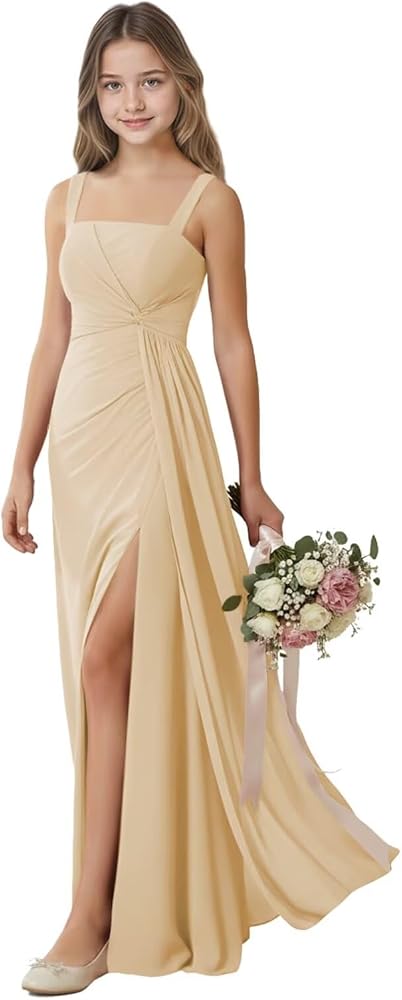 Jr Bridesmaid Dresses Features:Spaghetti Straps Junior Bridesmaid Dresses,Chiffon Pleated Girls Bridesmaid Dresses with Slit,Square Neck Flower Girl Dress for Teen Girls Wedding Guest Side Slit Formal Dress features Square Neck,Spaghetti Straps,Sleeveless,Side Slit,Pleated,Back Zipper,Floor-Length,A-Line,breezy,light fabric,practical and easy to wear,with a perfect fit!Your little princess will be excited about this gorgeous Girls Formal Dress!