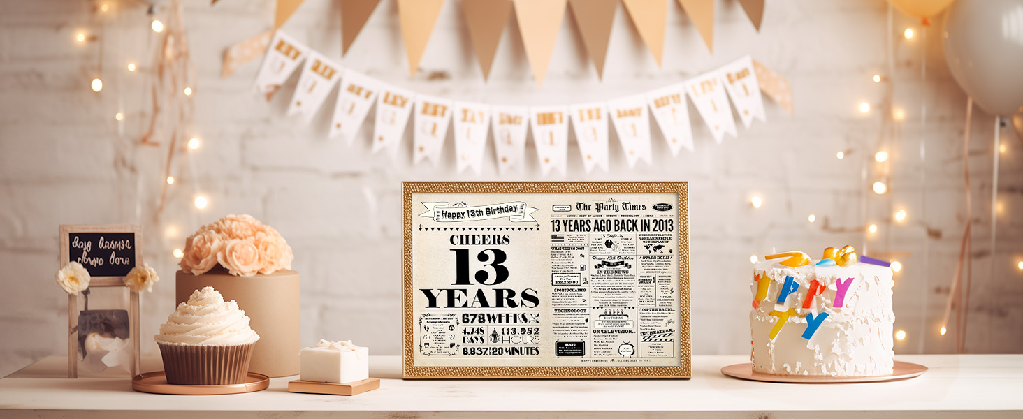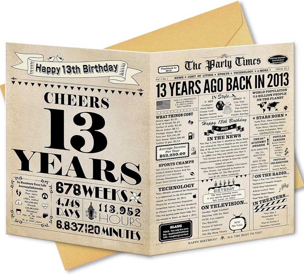 • 【تطبيق متعدد الاستخدامات】لا تتوقف بطاقة عيد الميلاد هذه التي تبلغ من العمر 13 عامًا عن كونها مجرد بطاقة. يمكنك أيضًا استخدامه كهدية عيد ميلاد، أو دعامة للصور، أو ملصق، أو زينة للحفلات، أو حتى صورة فوتوغرافية. يمكنك أيضًا تأطيرها كصورة عزيزة لإحياء ذكرى هذا الإنجاز.