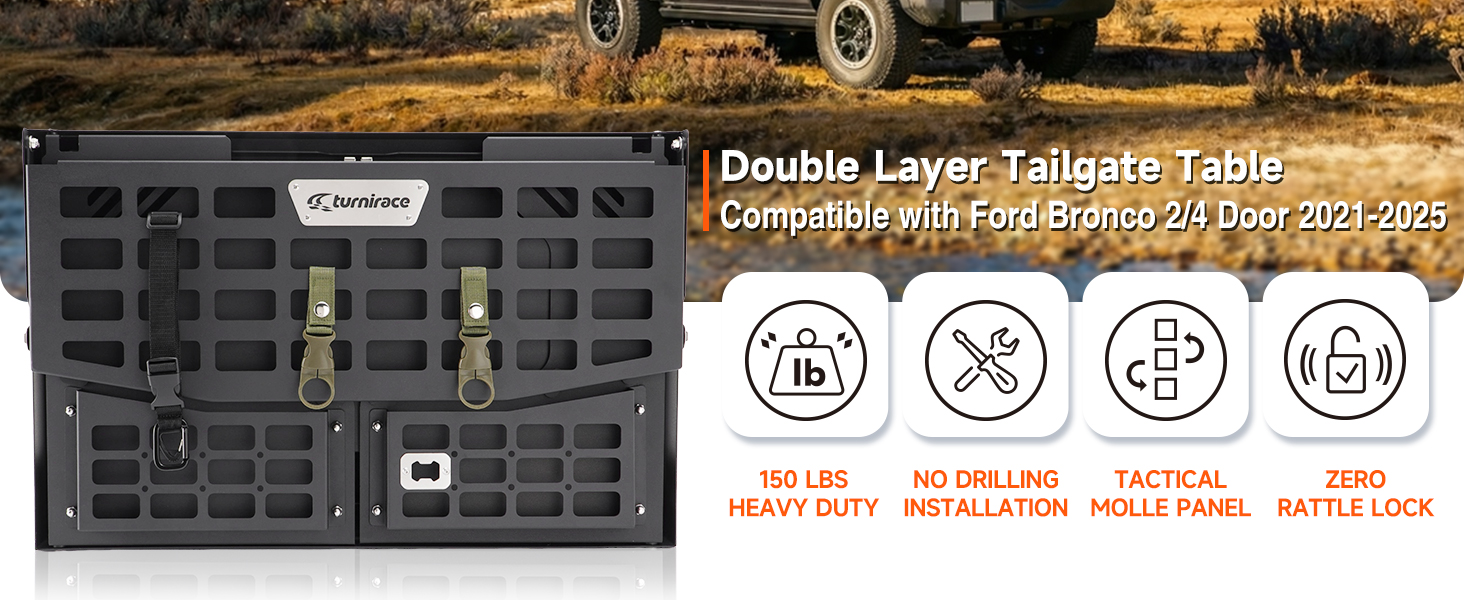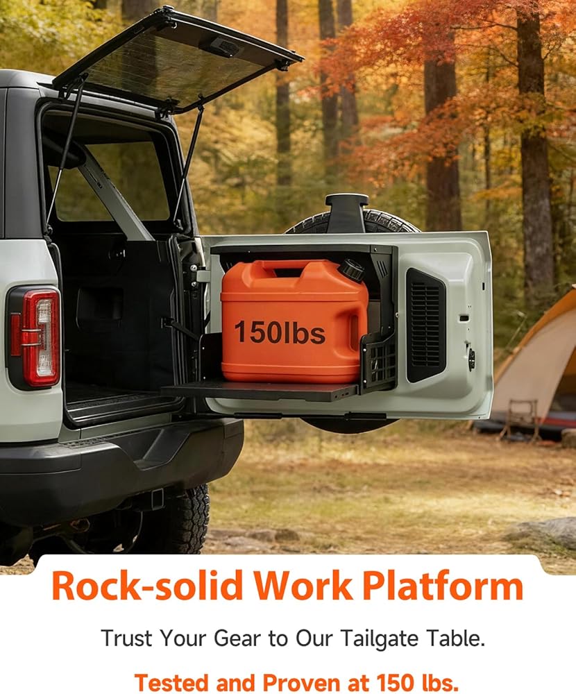 طاولة الباب الخلفي مع لوحة مولي متوافقة مع Ford Bronco 2/4 Door 2021 2022 2023 2024 2025، رف تخزين للباب الخلفي بطبقة مزدوجة قابل للطي، تم تجميعه مسبقًا (غير مناسب لرياضة برونكو)