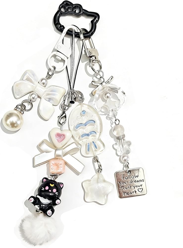 • 3 Adorable Designs in 1 Set: Combines 3 trendy charms — a cute cat key ring (with bow + pearl), a cute plastic cat (with pom-pom), and a shimmery Pisces star (plus a Follow Your Dreams bell charm) — perfect for mixing & matching Y2K/aesthetic vibes.