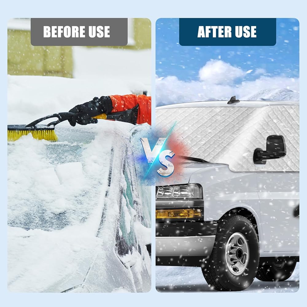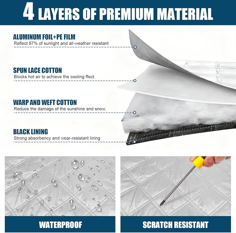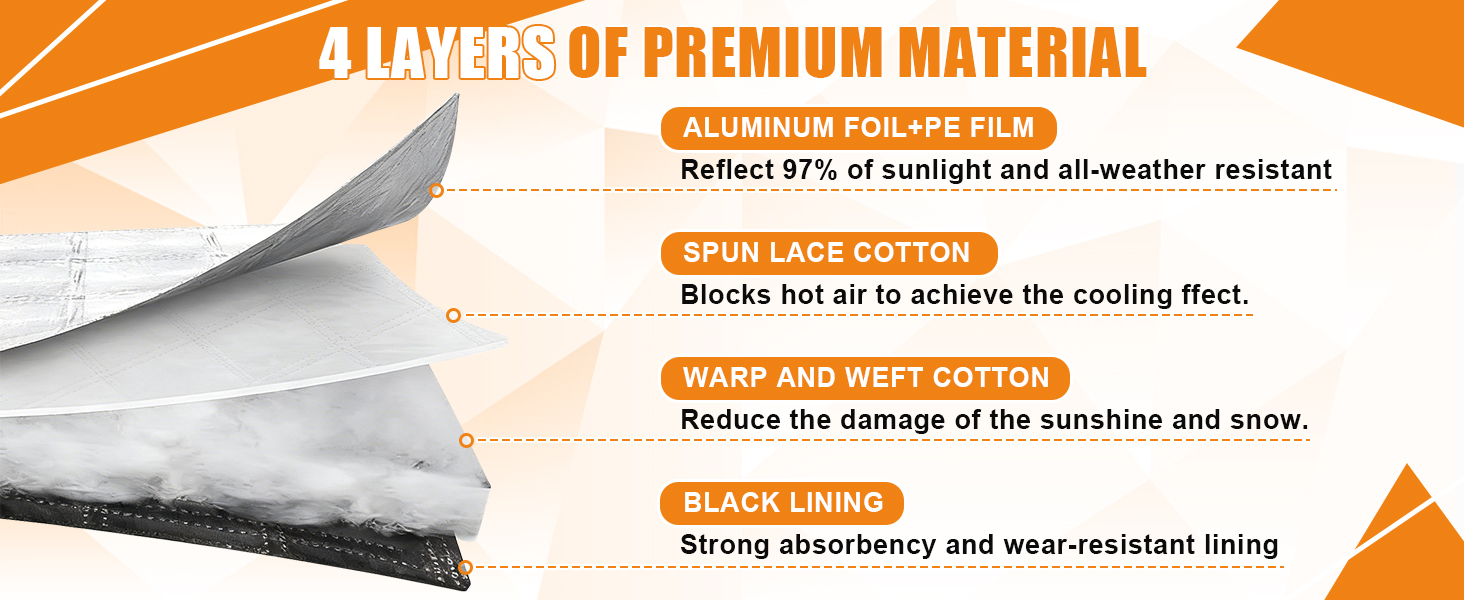 [واقي من الشمس ومقاوم للماء]: يحافظ على نوافذك آمنة من أشعة الشمس المباشرة في الصيف، ويخفض درجة الحرارة داخل الكابينة، ويحمي لوحة القيادة من التشقق والبهتان من أشعة الشمس الضارة؛ يمنع أيضًا تساقط الثلوج والصقيع على نوافذك في الشتاء.