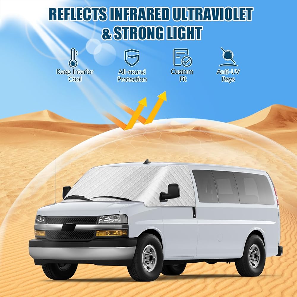 [الإعداد]: غطاء شاشة النافذة هذا مناسب لسيارة Express/GMC Savana Van 1996-2026، ويمكن إجراء تخصيص خاص للسيارة ليناسب سيارتك إلى أقصى حد.
