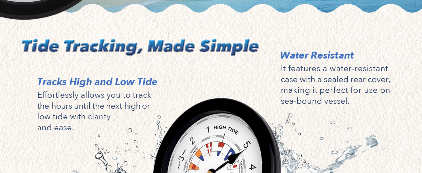 تصميم متين: يتميز برسومات ملونة للمد العالي والمنخفض، مع علبة مقاومة للماء من بلاستيك ABS عالي الجودة مع غطاء خلفي. يسمح الغطاء الخلفي المقفل بنظام تثبيت لولبي آمن ثلاثي النقاط بتركيبه على الحائط؛ فهو يثبت الساعة في مكانها على سفينتك المتجهة إلى البحر.