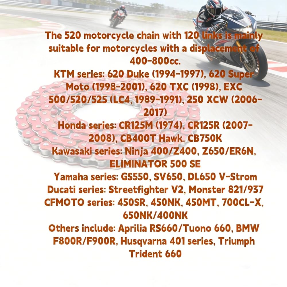 • ✅ مطابقة دقيقة: مصممة خصيصًا لـ 520 سلسلة مواصفات، مناسبة لنماذج الطرق الوعرة السائدة (مثل Honda CRF وYamaha YZ وSuzuki وKawasaki وDucatietc.).